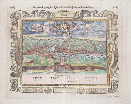 Tavola tratta dalla ' Cosmographiae Universalis, edizione in tedesco, Basilea, seconda metà del XVI secolo.La ' Cosmographiae Universalis ' di Sebastian Münster (1488-1552), stampata per la prima volta Basilea nel 1544 dall’editore Heinrich Petri, venne più volte aggiornata e aumentata di nuove carte geografiche e rappresentazioni urbane nelle sue numerose edizioni che arrivano all’inizio del secolo successivo. Münster aveva lavorato a raccogliere informazioni al fine di ottenere un'opera che non deludesse le aspettative e, dopo un'ulteriore pubblicazione in tedesco abbellita da 910 stampe su legno, giunse nel 1550 all'edizione definitiva in latino, illustrata da 970 silografie. Vi furono poi numerose edizioni in diverse lingue, fra cui latino, francese, italiano, inglese e ceco. Dopo la sua morte di Münster (1552), Heinrich Petri prima, e il figlio Sebastian poi, continuarono la pubblicazione dell’opera. La ' Cosmographia universalis ' fu uno dei libri più popolari e di successo del XVI secolo, e vide ben 24 edizioni in 100 anni: l'ultima edizione tedesca venne pubblicata nel 1628, molto tempo dopo la morte dell'autore. La ' Cosmographia ' conteneva non solo le ultime mappe e vedute di tutte le città più famose, ma anche una serie di notizie enciclopediche di dettagli relative al mondo conosciuto, e sconosciuto. Il particolare successo anche commerciale di quest'opera fu dovuto in parte alle belle incisioni (tra i cui autori si possono citate Hans Holbein il Giovane, Urs Graf, Hans Rudolph Manuel Deutsch, David Kandel). Silografia, bella coloritura a mano, in buone condizioni. Plate taken from the ' Cosmographiae Universalis, German edition, Basel, second half of the 16th Century. The ' Cosmographiae Universalis ' of Sebastian Münster (1488-1552), printed for the first time in Basel in 1544 by the publisher Heinrich Petri, was updated several times and increased with new maps and urban representations in its many editions until the beginning of the next century. Münster had worked to collect information in order to obtain a work that did not disappoint expectations and, after a further publication in German embellished with 910 woodblock prints, arrived in 1550 to the final edition in Latin, illustrated by 970 woodcuts. There were then numerous editions in different languages, including Latin, French, Italian, English and Czech. After his death in Münster (1552), Heinrich Petri first, and then his son Sebastian, continued the publication of the work. The ' Cosmographia universalis ' was one of the most popular and successful books of the 16th century, and saw as many as 24 editions in 100 years: the last German edition was published in 1628, long after the author's death. The ' Cosmographia ' contained not only the latest maps and views of all the most famous cities, but also a series of encyclopedic details related to the known, and unknown, world. The particular commercial success of this work was due in part to the beautiful engravings (among whose authors can be mentioned Hans Holbein the Younger, Urs Graf, Hans Rudolph Manuel Deutsch, David Kandel). Woodcut, beautiful hand-coloring, in good condition. Cfr.
