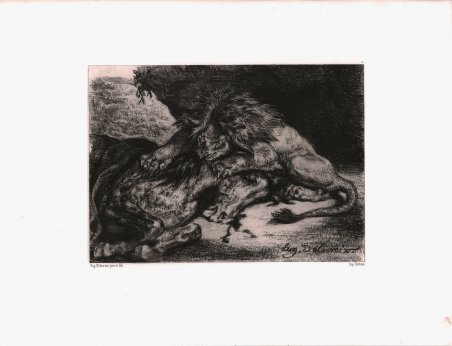 Litografia, 1844, firmata all'interno dell'immagine in basso a destra: "Eug. Delacroix. "; numerata in alto a destra: "17"; in basso, sotto l’immagine: "Eug. Delacroix pinx et lith." e "Imp.Bertauts."; al centro timbro a secco: "LES ARTISTES CONTEMPORAINS". Quarto stato, di cinque. Stampato da Bertauts, Parigi. Pubblicato da Goupil, Vibert & Cie, Parigi per Les Artistes contemporains. In ottimo stato di conservazione La scena raffigura un leone che attacca il corpo di un cavallo nei pressi di una grotta rocciosa. Solo la parte anteriore del cavallo è mostrata, distesa su un fianco a terra. Il leone si accovaccia sopra il cavallo e preme con le zampe anteriori, con gli artigli sfoderati, mentre affonda i denti nel collo del cavallo. C'è un'espressione feroce e selvaggia sul volto del leone. La scena è ambientata in un paesaggio roccioso indefinito. Delacroix viaggiò in Nord Africa nel 1832, visitando il Marocco e l'Algeria - una visita che alimentò il suo interesse per le culture non europee. L'interesse per i luoghi esotici affascinò gli europei e coincise con l'ascesa del turismo; i pittori (molti dei quali non lasciarono mai l'Europa) raffigurarono luoghi lontani e ambienti culturali diversi, compresi gli harem. La ferocia scatenata degli animali selvaggi - in particolare i grandi felini - stimolò l’immaginazione di Delacroix: scene come questa di un leone che attacca un cavallo figurano spesso nella sua produzione artistica. Eugène Delacroix (Charenton-Saint-Maurice ' 1798 ' - ' Parigi ' 1863), è il maggiore pittore romantico francese: la sua opera ' segna una svolta decisiva nella storia della pittura e apre la strada alle correnti realiste ed espressioniste. Allievo di P.-N. Guérin, nel cui studio conobbe Géricault, si formò soprattutto studiando al Louvre le opere di P. P. Rubens e di P. Veronese. Grande fu l'impulso dato alla sua fantasia dalla lettura di Shakespeare, Goethe, Byron e W. Scott. Nel 1825 Delacroix compiva un viaggio in Inghilterra, e qui era impressionato da Turner e da Constable e specialmente si stringeva d'amicizia con R. Bonington, che lo seguiva a Parigi. La Morte di M. Falier, sotto l'impressione della grande pittura veneziana, è ispirata al Byron. Nel 1827 il Salon presentò a fronte J.-D. Ingres, capo della corrente classicheggiante, e il Delacroix, capo della corrente romantica (questi vi espose, tra l'altro, la Morte di Sardanapalo). Le guerre per l'indipendenza ellenica avevano suscitato in Delacroix un profondo interesse per il mondo orientale, cui egli si rivolgeva anche attraverso notevoli studi di miniature persiane. Egli conobbe direttamente l'Oriente soltanto nel 1832 (viaggio in Marocco), e ne riportò un'impressione immediata, che introdusse il mondo islamico nella pittura francese come tema pittorico attuale, di ambiente e di paesaggio, e non soltanto come suggestione letteraria e fantastica. Fu, questo viaggio, uno dei rari avvenimenti della vita del Delacroix (il viaggio in Italia, accarezzato in gioventù, non fu mai compiuto) che fu interamente dedicata alla pittura, sì che il catalogo della sua opera elenca ben 9140 lavori. Grande amico del Delacroix fu Ch. Baudelaire, che all'amico pittore dedicò le pagine più belle della sua prosa critica. Enormi furono la fama del Delacroix e le ripercussioni delle sue opere, esposte regolarmente nei Salons parigini, per molti anni. Bibliografia Delteil, Le Peintre-Graveur Illustré (XIXe et XXe siècles), 126, IV/V. Lithograph, 1844, signed within the image: "Eug. Delacroix. "; lettered: "17" and with production line: "Eug. Delacroix pinx et lith." and "Imp.Bertauts."; blindstamped: "LES ARTISTES CONTEMPORAINS" Fourth state, of five. Printed by Bertauts, Paris. Published by Goupil, Vibert & Cie., Paris for ' Les Artistes contemporains, with the blind stamp. The scene depicts a male lion attacking the body of a horse near a rocky cave. Only the front portion of the horse is shown, lying on its side on the ground. The lion crouches above the horse and presses down with its front paws, claws extended, as it sinks its teeth into the horse's neck. There is a fierce, wild eyed expression on the lion's face. The scene is set in an undefined rocky landscape. Delacroix traveled to North Africa in 1832, visiting Morocco and Algeria--a visit that fueled his interest in non-European cultures. The interest in exotic locales fascinated Europeans and coincided with the rise of tourism; painters (many of whom never left Europe) depicted distant places and different cultural settings, including harems. For the sophisticated and urbane Delacroix, the unleashed ferocity of wild animals--particularly the big cats--stirred his imagination. Scenes such as this of a lion attacking a horse figured frequently in Delacroix's art. Eugène Delacroix (Charenton-Saint-Maurice ' 1798 ' - ' Parigi ' 1863), french painter, draughtsman and lithographer, was one of the towering figures of the Romantic movement and one of the last major artists to devote a large part of his career to mural painting in the heroic tradition. Lorenz Eitner (An Outline of 19th Century European Painting, 1987) describes him as ‘the last great European painter to use the repertory of humanistic art with conviction and originality. In his hands, antique myth and medieval history, Golgotha and the Barricade, Faust and Hamlet, Scott and Byron, tiger and Odalisque yielded images of equal power.’ He was the son of a diplomat, Charles Delacroix, who at the time of his son's birth was ambassador in The Hague, but it has been suggested that his natural father was the great statesman Talleyrand, a friend of the family. His mother, Victoire Oeben, was the daughter of Jean-François Oeben, one of the most distinguished furniture makers of his day. Delacroix had a good education and grew up with a love of literature and music as well as art. In 1815 he began studying with Pierre-Narcisse Guérin, who had earlier taught Géricault (whose work greatly 