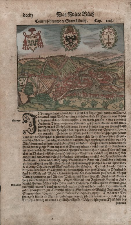 Tavola tratta dalla ' Cosmographiae Universalis, edizione in tedesco, Basilea, seconda metà del XVI secolo.La ' Cosmographiae Universalis ' di Sebastian Münster (1488-1552), stampata per la prima volta Basilea nel 1544 dall’editore Heinrich Petri, venne più volte aggiornata e aumentata di nuove carte geografiche e rappresentazioni urbane nelle sue numerose edizioni che arrivano all’inizio del secolo successivo. Münster aveva lavorato a raccogliere informazioni al fine di ottenere un'opera che non deludesse le aspettative e, dopo un'ulteriore pubblicazione in tedesco abbellita da 910 stampe su legno, giunse nel 1550 all'edizione definitiva in latino, illustrata da 970 silografie. Vi furono poi numerose edizioni in diverse lingue, fra cui latino, francese, italiano, inglese e ceco. Dopo la sua morte di Münster (1552), Heinrich Petri prima, e il figlio Sebastian poi, continuarono la pubblicazione dell’opera. La ' Cosmographia universalis ' fu uno dei libri più popolari e di successo del XVI secolo, e vide ben 24 edizioni in 100 anni: l'ultima edizione tedesca venne pubblicata nel 1628, molto tempo dopo la morte dell'autore. La ' Cosmographia ' conteneva non solo le ultime mappe e vedute di tutte le città più famose, ma anche una serie di notizie enciclopediche di dettagli relative al mondo conosciuto, e sconosciuto. Il particolare successo anche commerciale di quest'opera fu dovuto in parte alle belle incisioni (tra i cui autori si possono citate Hans Holbein il Giovane, Urs Graf, Hans Rudolph Manuel Deutsch, David Kandel). Silografia, bella coloritura a mano, in buone condizioni. Plate taken from the ' Cosmographiae Universalis, German edition, Basel, second half of the 16th Century. The ' Cosmographiae Universalis ' of Sebastian Münster (1488-1552), printed for the first time in Basel in 1544 by the publisher Heinrich Petri, was updated several times and increased with new maps and urban representations in its many editions until the beginning of the next century. Münster had worked to collect information in order to obtain a work that did not disappoint expectations and, after a further publication in German embellished with 910 woodblock prints, arrived in 1550 to the final edition in Latin, illustrated by 970 woodcuts. There were then numerous editions in different languages, including Latin, French, Italian, English and Czech. After his death in Münster (1552), Heinrich Petri first, and then his son Sebastian, continued the publication of the work. The ' Cosmographia universalis ' was one of the most popular and successful books of the 16th century, and saw as many as 24 editions in 100 years: the last German edition was published in 1628, long after the author's death. The ' Cosmographia ' contained not only the latest maps and views of all the most famous cities, but also a series of encyclopedic details related to the known, and unknown, world. The particular commercial success of this work was due in part to the beautiful engravings (among whose authors can be mentioned Hans Holbein the Younger, Urs Graf, Hans Rudolph Manuel Deutsch, David Kandel). Woodcut, beautiful hand-coloring, in good condition. Cfr.