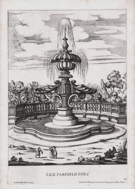 Veduta tratta dalla serie ' Le Fontane di Roma, 1680 circa. Iniziata da Giovan Battista Falda nel 1667 circa, la serie venne ultimata da Giovanni Francesco Venturini, che incise - da propri disegni - le due serie ' Le fontane del giardino estense in Tivoli ' e ' Le fontane ne' palazzi e ne' giardini di Roma con li loro prospetti et ornamenti, pubblicate dall'editore romano G. G. De Rossi (1684 circa) a completamento della celebre opera. Venturini fu incisore, nato a Roma nel 1650, morto dopo il 1710. Il suo nome è specialmente legato alle due serie di stampe, da lui disegnate e incise, ' Le fontane ne' ' palazzi e ne' giardini di Roma ' e ' Le fontane del giardino estense in Tivoli, ' con. ' veduta della cascata del fiume Aniene, pubblicate da Giovanni Giacomo De Rossi, circa il 1684, a completamento della celebre opera di G. B. Falda. Di sua invenzione sono le incisioni per l'opera sulle ' Chiocciole ' di Filippo Buonanni. Collaborò alla raccolta ' Insignium Romae templorum prospectus, e ad altre imprese dell'editoria calcografica del tempo. Incise anche da Polidoro da Caravaggio, dal Nasini, dal Domenichino (Caccia di Diana) e da altri. Acquaforte, con margini, in buono stato di conservazione. Bibliografia TIB ' The Illustrated Bartsch ' - Commentary Volumes. 1978–, cat. n. 47 pt. 2 Commentary pp. 4-29, .005-.055; pp. 41-42, .077-080. View taken from the series ' Le Fontane di Roma, ' 1680 approx. Begun by Giovan Battista Falda in about 1667, the series was completed by Giovanni Francesco Venturini, who engraved - from his own drawings - the two series ' Le fontane del giardino estense in Tivoli ' and ' Le fontane ne' palazzi e ne' giardini di Roma con li loro prospetti et ornamenti, published by the Roman publisher G. G. De Rossi (about 1684) to complete the famous work. Venturini was an engraver, born in Rome in 1650 and died after 1710. His name is especially linked to the two series of prints, drawn and engraved by him, ' Le fontane ne' palazzi e ne' giardini di Roma ' and ' Le ' fontane del giardino estense in Tivoli, con. view of the waterfall of the Aniene River, published by Giovanni Giacomo De Rossi, circa 1684, completing the celebrated work of G. B. Falda. Of his own invention are the engravings for the work on the ' Chiocciole ' by Filippo Buonanni. He collaborated on the collection ' Insignium Romae templorum prospectus, and other enterprises of intaglio publishing of the time. He also engraved by Polidoro da Caravaggio, Nasini, Domenichino (Hunting Diana) and others. Etching, with margins, in good condition. Bibliografia TIB ' The Illustrated Bartsch ' - Commentary Volumes. 1978–, cat. n. 47 pt. 2 Commentary pp. 4-29, .005-.055; pp. 41-42, .077-080. Cfr.