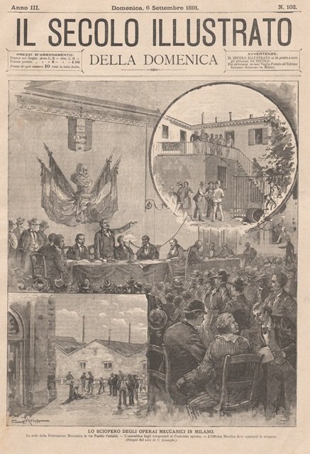Insieme di tre vignette: la sede della Federazione Meccanica in via Panfilo Castaldi, l’assemblea degli scioperanti e l’officina Elvetica dove cominciò lo sciopero il 27 agosto 1891. Testo al retro