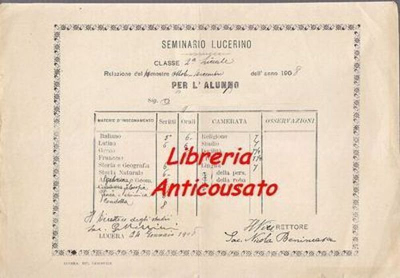 LUCERA PAGELLA SEMINARIO LUCERINO DELL'ANNO 1908 originale diploma liceo antico