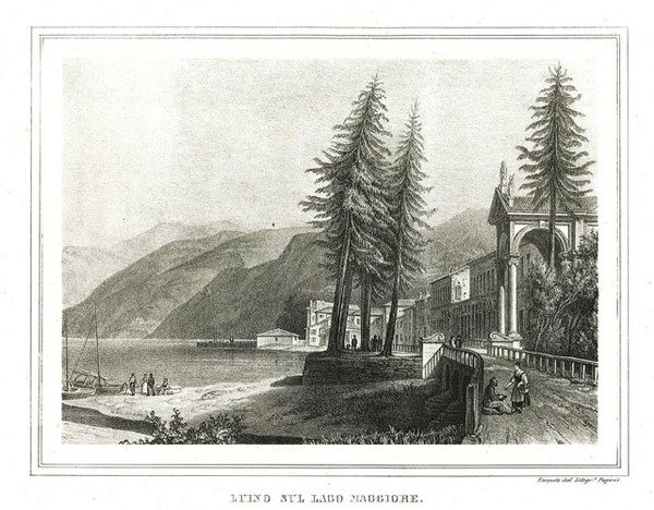 Stampa antica ed originale con veduta del lungolago della cittadina, sullo sfondo le montagne svizzere