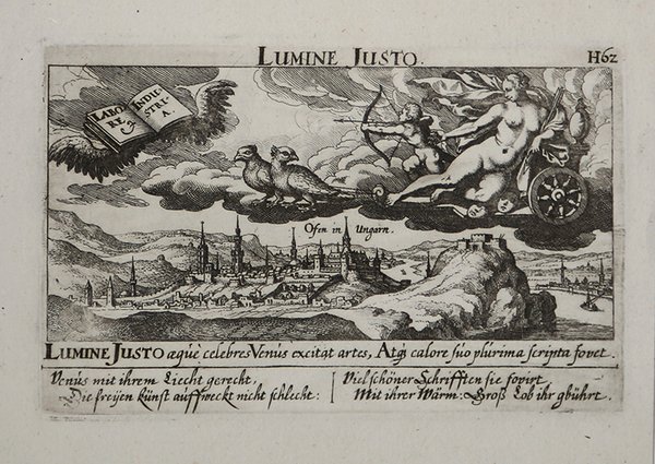 Veduta tratta dall'edizione del 1678 della celebre ' Sciagraphia Cosmica ' nota anche con il titolo ' Das ist Newes Emblematisches Buechlei, dainen in acht Centurijs die vornembste Stat, Vestung, Schlosser der ganzen Welt. ' stampata a Norinberga. La ' Sciagraphia Cosmica, venne ampliata sotto la supervisione di Kieser dopo la morte di Meisner nel 1625, arrivando quindi ad una composizione di 800 magnifiche incisioni. ' Ogni opera è caratterizzata da un motto sopra l'immagine, e da versi emblematici (in latino o tedesco). L'opera è la combinazione di due generi allora popolari, il libro degli stemmi e il "Teatro delle città". Tra i maestri incisori e miniatori che contribuirono a questa serie ci sono Matthäus Merian, Sebastian Furck, Christian Stimmer e forse anche Meisner stesso, che concepì l'opera e contribuì a buona parte della prosa. ' Incisione in rame, con margini, in perfetto stato di conservazione. View taken from the 1678 edition of the famous ' Sciagraphia Cosmica ' also known with the full title ' Sciagraphia Cosmica: ' Das ist Newes Emblematisches Buechlei, dainen in acht Centurijs die vornembste Stat, Vestung, Schlosser der ganzen Welt. printed in Nuremberg. The ' Sciagraphia Cosmica, was expanded under the supervision of Kieser after the death of Meisner in 1625, thus arriving at a composition of 800 magnificent engravings. ' Each engraving is characterized by a motto above the image, and by emblematic verses (in Latin or German). The work is a combination of two then-popular genres, the book of coats of arms and the "Town Book". Among the master engravers and illuminators who contributed to this series are Matthäus Merian, Sebastian Furck, Christian Stimmer, and perhaps Meisner himself, who conceived the work and contributed much of the prose. ' Copperplate engraving, with margins, in perfect condition. Cfr.