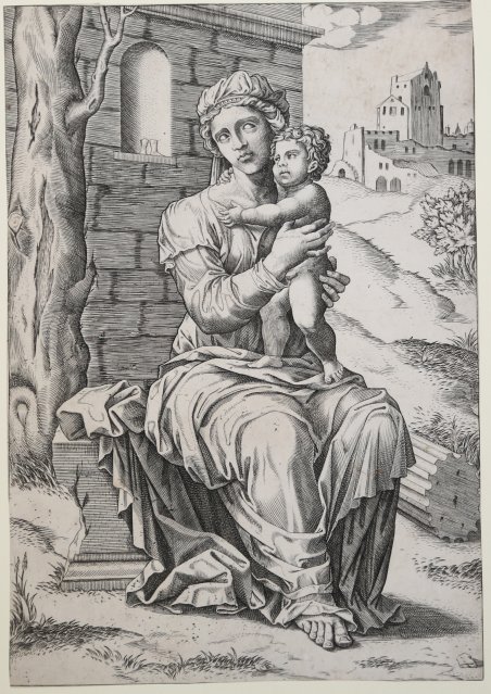Bulino, circa 1550, privo di firma ed indicazioni editoriali. Opera non descritta dai repertori; la composizione e il segno rimandano anche alla produzione incisoria fiorita a Roma intorno allo stampatore e incisore Antonio Lafreri (1512-1577) e al cosiddetto Speculum romanae magnificentiae. Tra gli incisori impiegati dalla bottega di Lafreri, potrebbe essere opera di Cornelis Bos, del quale segue lo stile grafico, e al quale attribuiamo l’intaglio. In questa stampa vediamo rappresentata in primo piano assisa la Vergine che accoglie e sorregge tra le braccia il suo bambino. La donna è seduta su una base marmorea, il lungo abito scende morbido a terra scoprendo solo un piede, ha i capelli raccolti all’interno di un velo e lo sguardo rivolto verso l’alto. Il Bambino, paffuto e nudo, si stringe al collo della madre e cerca di catturare il suo sguardo. Le due figure sono poste davanti a un muro scuro che divide verticalmente lo spazio che si apre a destra verso il profilo di una città. A sinistra un alto tronco spoglio che contribuisce allo slancio della composizione. A destra una colonna in rovina a terra simbolo del mondo antico pagano. Il segno lungo e intenso, raramente incrociato, genera contrasti chiaroscurali e crea un’atmosfera argentea. Gli occhi non sono descritti quasi si trattasse di una statua in marmo, le proporzioni esagerate rimandano certamente alla lezione di Michelangelo. Si potrebbe ipotizzare di riconoscere un modello, o almeno una certa analogia, nelle sculture raffiguranti Mosè o Giuliano de Medici. Magnifica prova di questa rara incisione, impressa su carta vergata coeva con filigrana “brocca con fiore”, rifilata alla linea marginale, in eccellente stato di conservazione. Engraving, circa 1550, lacking signature and printing details. Work not described by repertories; composition and style refer to the engraving production that flourished in Rome around the printer and engraver Antonio Lafreri (1512-1577) and the so-called Speculum romanae magnificentiae. Among the engravers employed by Lafreri's workshop, it could be the work of Cornelis Bos, whose graphic style it follows, and to whom we attribute the intaglio. In this print we see depicted in the foreground seated the Virgin welcoming and holding her child in her arms. The woman is seated on a marble base, her long gown falls softly to the ground revealing only one foot, her hair is gathered within a veil, and she is looking upward. The Child, plump and naked, clasps his mother's neck and tries to catch her gaze. The two figures stand in front of a dark wall that vertically divides the space that opens to the right to the outline of a city. To the left is a tall bare trunk that contributes to the momentum of the composition. On the right a ruined column on the ground symbolizes the ancient pagan world. The long, intense mark, rarely crossed, generates chiaroscuro contrasts and creates a silvery atmosphere. The eyes are not described as if it were a marble statue; the exaggerated proportions certainly hark back to Michelangelo's lesson. One might assume to recognize a model, or at least some analogy, in sculptures depicting Moses or Giuliano de Medici. Magnificent proof of this rare engraving, printed on contemporary laid paper with “pitcher with flower” watermark, trimmed at the marginal line, in excellent condition. Cfr.