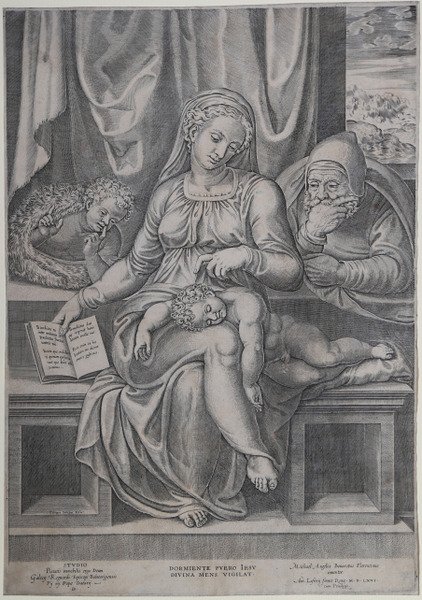 Bulino, 1566, firmato in lastra, sotto la panca a sinistra Philippus Sericus fecit, e datata MDLXVI, a destra della didascalia. Da un soggetto di Michelangelo Buonarroti.Esemplare nel secondo stato di tre, con l'indirizzo di Antonio Lafreri in basso a destra. Il primo stato, una prova di stampa avanti la lettera, è conosciuto per una sola prova al British Museum, mentr il terzo stato viene stampato da Giovanni Orlandi nel 1602.Splendida prova, impressa su carta vergata coeva cn filigrana "pellegrino nel cerchio con stella" rifilata alla linea marginale, in ottimo stato di conservazione. Il soggetto dell’incisione è tratto dal disegno a sanguigna di Michelangelo della Collezione Duke of Portland di Londra, incluso tra le opere eseguite intorno al 1540 per Vittoria Colonna.Secondo Alessia Alberti "il soggetto di questo bulino è derivato dall’invenzione di Michelangelo attraverso la mediazione di un dipinto. Anche se di questo non si hanno prove certe, lo si evince oltre che dalla quantità di varianti introdotte rispetto all’originale, anche dal linguaggio grafico teso a imitare i delicati passaggi tonali e la luminosità della pittura. In questa direzione si era già espressa Evelina Borea (Borea, 1980, p. 269) che però individuava cautamente tale modello nel dipinto della National Gallery di Londra, da escludere in quanto a sua volta introduce varianti che qui non sono state recepite. Grazie alla dedicatoria questa tavola fornisce precisi agganci con un personaggio dell’epoca, l’ecclesiastico francese Gallois de Regard (1512-1582), all’epoca dell’incisione vescovo di Bagnoregio (1563-1568), a Roma dal 1555 con incarichi di datario presso Paolo iv e poi Pio iv (Journal, 1964).L’espressione che precede il nome del dedicatario «Pietatis immobilis erga Deum» è ripresa, con la variante di Deum in luogo di Principem, dalla Vita di Vitellio di Svetonio, laddove è menzionata la scritta sulla statua eretta in sua memoria. […] Dopo essere appartenuta all’editore Lafrery (morto nel 1577), la matrice ricompare nel 1602 con l’indirizzo di Giovanni Orlandi. Potrebbe pertanto identificarsi con la «Madonna di ma, Filippo, foglio», ereditata dal nipote di Lafrery, Claude Duchet nel 1581 (Ehrle, 1908, p. 45, riga 188), pervenuta a Giacomo Gherardi e da questi a Quintilia Lucidi (nel 1598 in casa del padre di Quintilia, Rocco, sono registrati due rami che corrispondono a questo soggetto «la mad.a di Michel Angelo che dorme con un putto In foglio reale», Pagani, 2012, p. 79, n. 8; «la mad.a di m.angelo con il putto che dorme», Pagani, 2012, p. 83, n. 95), che più tardi ha ceduto i suoi beni a Giovanni Orlandi".La prima traduzione a bulino del disegno è di Giulio Bonasone, e reca la data 1561.Questa incisione rappresenta la seconda delle due versioni del tema che Philippe Soye incise per Antonio Lafrery. La prima, molto diversa nella raffigurazione e posa di tutte le figure, e nei dettagli architettonici, è datata 1565. Questa seconda versione è molto più vicina all’opera del Bonasone.La scena raffigura Maria, seduta, con le gambe accavallate, e il Bambino che dorme sdraiato sulla panca con la testolina appoggiata sulla gamba di lei. La Vergine, con la mano destra, tiene aperto un libro sulle cui pagine sono riportati i versetti biblici relativi alla beatitudine di Maria. Più indietro, a destra, coprendosi la bocca con la mano, è S. Giuseppe, di cui nelle Sacre Scritture non è mai riportata la parola. Sulla sinistra, è raffigurato l’arcangelo Gabriele, con l’indice rivolto verso l’alto, rimandando probabilmente al concetto espresso nella didascalia: DORMIENTE PUERO IESU DIVINA MENS VIGILA ovvero Mentre il bambino dorme, la mente divina vigila. L’incisione reca la dedica a Galesio Reguardi, vescovo di Bagnoregio “datario di Pio IV, Papa”. Bibliografia Alberti (2015), n. 279; Bartsch, XV.128.66; Catelli Isola, p. 60 n. 25; Marigliani – Biguzzi, p. 45 n. 5; Massari, Iulio Bonasone, p. . Engraving, 1566, signed Philippus Sericus fecit lower left, with the address of Antonio Lafrery and the date MDLXVI lower left. After a drawing by Michelangelo. Example of the secondo state of three, prited by Antonio Lafreri in 1566. The first state, without letter, is known in a single example at the British Museum, while the third state is printed by Giovanni Orlandi in 1602.A very good impression, printed on contemporary laid paper with "pilgrim in a cirlce with star" watermark, trimmed to the platemark, good condition.The subject for these print is from a sanguine drawing by Michelangelo in the Duke of Portland’s Collection in London, included among the works executed around 1540 for Vittoria Colonna.The first print made of this design is Giulio Bonasone’s, which is dated 1561.Philippe Soye engraved two versions of this theme, both published by Antonio Lafrery. The first one, dated 1565 with major changes in the apparence of all the figures. This engraving represents the second version, dated 1566, and close to Bonasone’s print.The scene depicts Mary sitting with his legs crossed, and the Christ Child asleep on her lap. The Virgin, with his right hand, holding open a book whose pages are the Biblical verses related to the Beatitude of Mary. Further back, St John the Baptist raising his figure to his lips, On the left, depicts the archangel Gabriel, with the index finger pointing up, probably referring to the concept expressed in the latin caption: DORMIENTE PUERO IESU DIVINA MENS VIGILA (While the Child sleeps, the Divine Mind supervises).Alessia Alberti "il soggetto di questo bulino è derivato dall’invenzione di Michelangelo attraverso la mediazione di un dipinto. Anche se di questo non si hanno prove certe, lo si evince oltre che dalla quantità di varianti introdotte rispetto all’originale, anche dal linguaggio grafico teso a imitare i delicati passaggi tonali e la luminosità della pittura. In questa direzione si era già espressa Evelina Borea (Bor