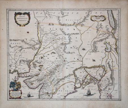 Dettagliata carta della regione compresa tra Pakistan, Afghanistan e Bangladesh; estesa alle regioni al di là del Gange ed Indo, comprensiva dell' Himalaia e comprendente Katmandu, Kabul e le altre leggendarie città comprese nelle antiche strade commerciali. Arricchita da elementi decorativi. Willem Janszoon Blaeu, avviò nel 1599 la sua attività di costruttore di globi e strumenti astronomici ad Amsterdam. Nel 1630, dopo aver comprato alcune lastre dell’atlante del Mercator da Jodocus Hondius II, fu in grado di pubblicare un volume di 60 mappe con il titolo di ' Atlantis Appendix. Cinque anni dopo, pubblicò i primi due volumi del suo atlante ' Atlas Novus ' o ' Theatrum Orbis Terrarum, ' in sei libri. Dopo la sua morte, Joan (Johannes) continuò l’opera paterna, completando l’intera serie di sei volume dell’Atlas Novus ' intorno al 1655. Fu inoltre autore di un ' Atlas Maior sive Cosmographia Blaviana, in 12 volumi pubblicati nel 1662 -72. Sebbene pubblicate dopo la morte di Willem Janszoon Blaeu (1638) le carte spesso recano il suo imprint. Non è dato sapere se fossero tutte già pronte o se i figli Johannes e Cornelis le compilarono postume. Incisione in rame, coloritura coeva, in buono stato di conservazione. ' Detailed map of the region bounded by Pakistan, Afghanistan and Bangladesh and extending inland up the Ganges and Indus Rivers to Tartary and the Himalayas, including Katmandu, Kabul and other legendary cities along the great trading routes. Extends south to include a large portion of India, including Narsinga, Orixa Decan, etc.Elephants shown roaming in the Ganges and Camels east of Kabul. Decorative cartouches and sailing ships.Blaeu's map of India was one of the earliest Dutch maps to follow the work of Baffin. William Baffin's map represented a significant leap forward in the mapping and geographical understanding of India, significantly improving on earlier printed maps of India by Mercator and Linschoten. The differences are especially noteworthy in the interior of Baffin's map. The Indus River is shown for the first time in a relatively accurate fashion. Western and most of central India are mapped in a relatively accurate format for the first time. One of the most prominent features which first appears on the Baffin-Roe map is the Longe Walke, the route lined with trees between the palaces at Agra and Lahore. Willem Janszoon Blaeu, started in 1599 his business as a builder of globes and astronomical instruments in Amsterdam. In 1630, after buying some plates of the Mercator atlas from Jodocus Hondius II, he was able to publish a volume of 60 maps under the title Atlantis Appendix. Five years later, he published the first two volumes of his atlas Atlas Novus or Theatrum Orbis Terrarum, in six books. After his death, Joan (Johannes) continued his father's work, completing the entire six-volume Atlas Novus series around 1655. He was also the author of an Atlas Maior sive Cosmographia Blaviana, in 12 volumes published in 1662 -72. Although published after the death of Willem Janszoon Blaeu (1638) the maps often bear his imprint. It is not known whether they were all ready-made or if his sons Johannes and Cornelis completed them posthumously. ' Copperplate with original hand colur, very good condition. Cfr.