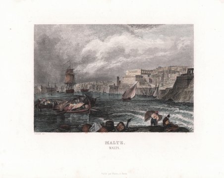 Veduta del porto di La Valletta tratta da Histoire de la Republique de Venise par M. Leon Galibert, stampata a Parigi da Furne, 1855. In basso a sinistra, in piccolo sotto la veduta la firma dell’incisore Aubert. In piccolissimo, al centro in basso Publiè par Furnè Paris. Il volume, una storia di Venezia dalle invasioni barbariche al dominio austriaco, è molto ben illustrato da 24 tavole f.t. incise su acciaio, per le più di vedute, di cui una bellissima della città. ' Acquaforte, finemente colorata a mano, in ottimo stato di conservazione. Veduta del porto di La Valletta tratta da Histoire de la Republique de Venise par M. Leon Galibert, stampata a Parigi da Furne, 1855. In basso a sinistra, in piccolo sotto la veduta la firma dell’incisore Aubert. In piccolissimo, al centro in basso Publiè par Furnè Paris. Il volume, una storia di Venezia dalle invasioni barbariche al dominio austriaco, è molto ben illustrato da 24 tavole f.t. incise su acciaio, per le più di vedute, di cui una bellissima della città. ' Acquaforte, finemente colorata a mano, in ottimo stato di conservazione. Cfr.