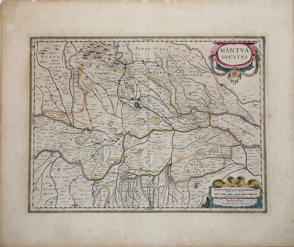 Carta geografica tratta da "Atlas Novus" edito ad Amsterdam tra il 1638 ed il 1666. Testo latino al verso. Johannes Janssonius, figlio dell'editore di Arnhem Jan Janssen, sposò Elisabeth Hondius, figlia di Jodocus Hondius, ad Amsterdam nel 1612. Dopo il suo matrimonio, si stabilì in questa città come libraio ed editore di materiale cartografico. Nel 1618 si stabilì ad Amsterdam accanto alla libreria di Willem Jansz. Blaeu, entrando in una seria competizione. Le sue attività non riguardavano solo la pubblicazione di atlanti e libri, ma anche di mappe singole e un vasto commercio di libri con filiali a Francoforte, Danzica, Stoccolma, Copenaghen, Berlino, Koningsbergen, Ginevra e Lione. Nel 1631 iniziò a pubblicare atlanti insieme a Henricus Hondius. Nei primi anni 1640 Henricus Hondius lasciò l'attività di pubblicazione di atlanti completamente a Janssonius. La concorrenza con Joan Blaeu, figlio e successore di Willem, nella produzione di atlanti spinse Janssonius ad ampliare il suo Atlas Novus finalmente in un'opera di sei volumi, in cui furono inseriti un atlante marino e un atlante del Vecchio Mondo. Dopo la morte di Joannes Janssonius, il negozio e la casa editrice furono continuati dagli eredi sotto la direzione di Johannes van Waesbergen (c. 1616-1681), genero di Joannes Janssonius. Le matrici degli atlanti di Janssonius furono in seguito vendute a Schenk e Valck. Incisione in rame, colorazione coeva, in buono stato di conservazione. Map centered on the town of Mantua. Oval title cartouche with guirlandes and coat-of-arms below. Scale cartouche with animal's head. Latin text to the verso.Taken from the "Atlas Novus" published in Amsterdam between 1638 and 1666. Johannes Janssonius (Arnhem, 1588-1664), son of the Arnhem publisher Jan Janssen, married Elisabeth Hondius, daughter of Jodocus Hondius, in Amsterdam in 1612. After his marriage, he settled down in this town as a bookseller and publisher of cartographic material. In 1618 he established himself in Amsterdam next door to Blaeu’s book shop. He entered into serious competition with Willem Jansz. Blaeu. His activities not only concerned the publication of atlases and books, but also of single maps and an extensive book trade with branches in Frankfurt, Danzig, Stockholm, Copenhagen, Berlin, Koningsbergen, Geneva, and Lyon. In 1631 he began publishing atlases together with Henricus Hondius. In the early 1640s Henricus Hondius left the atlas publishing business completely to Janssonius. Competition with Joan Blaeu, Willem’s son and successor, in atlas production prompted Janssonius to enlarge his Atlas Novus finally into a work of six volumes, into which a sea atlas and an atlas of the Old World were inserted. After the death of Joannes Janssonius, the shop and publishing firm were continued by the heirs under the direction of Johannes van Waesbergen (c. 1616-1681), son-in-law of Joannes Janssonius. The copperplates from Janssonius’s atlases were afterwards sold to Schenk and Valck. Copperplate with fine original hand colour, in good conditions. Cfr. Van der Krogt 1, 1:202