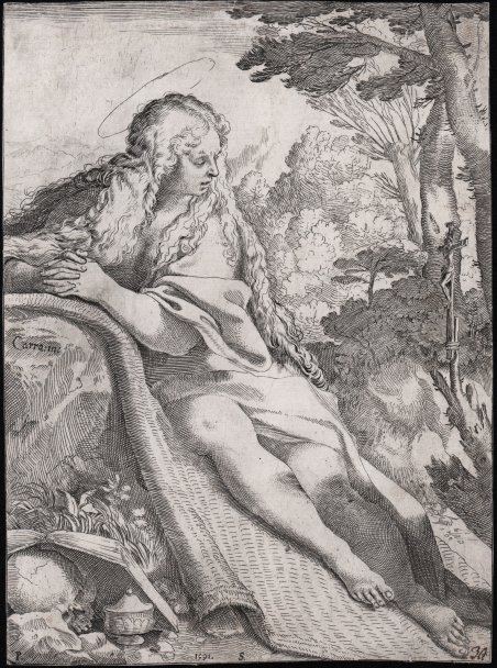 Acquaforte, 1591, datato in lastra in basso verso il centro, e firmato Carra: in. a sinistra, sul masso. Esemplare nel secondo stato di quattro (o terzo di cinque) con l’excudit dello stampatore Pietro Stefanoni aggiunto lungo il margine inferiore. Magnifica prova, impressa su carta vergata coeva, rifilata al rame, in ottimo stato di conservazione. Il disegno preparatorio di questa incisione si conserva al Louvre, ed è in controparte rispetto all’incisione. Bohn in TIB menziona un altro disegno preparatorio, oggi agli Uffizi che, secondo la sua opinione, doveva essere probabilmente un primo bozzetto per l’incisione, di cui la concezione di base è già formulata ma si riscontra un interesse maggiore per il paesaggio. Presso la Pinacoteca Nazionale di Bologna, si conserva un altro disegno di Annibale, ritenuto da De Grazia copia della parte superiore dell’acquaforte, e modello per un probabile piccolo dipinto devozionale, alla stregua del San Francesco adorante il Crocifisso. Un altro dipinto, della collezione Denis Mahon, mostra strettissime affinità con la stampa. Il dipinto è considerato come autografo del Carracci dallo stesso Mahon, che lo fa risalire al 1586-87, mentre Longhi, nel 1960, lo ha considerato come copia seicentesca derivante proprio da questa acquaforte. De Grazia collega questa incisione al dipinto carraccesco Venere e Adone, oggi al Prado. In particolare nota che le pose di Venere e Amore, e della stessa Maddalena derivano dall’incisione di Agostino modellata sul dipinto del Tintoretto Minerva che allontana Marte dalla Pace e dall’Abbondanza. Ne conclude, dunque, che “se il quadro di Mahon è realmente di Annibale e risale al 1586-1587 circa, la figura della Maddalena che vi compare è presa direttamente dal dipinto del Tintoretto”.Bellisismo esemplare. Etching, engraving, 1591, dated lower center and inscribed on the rock at left: 'Carra. in.'.Example of second state, with the inscription P S F added in the lower margin. A fine impression on contemporary laid paper, trimmed to the platemark, very good conditions. This etching demonstrates Annibale’s interest during the early 1590s in depicting a range of textures and dramatic contrasts of light and dark.Two preparatory studies are mentioned by Bohn in TIB. In her opinion, the one in the Uffizi, inv. no. 18207F was probably an early idea for the print, with the basic conception already formulated but with a greater interest in landscape that was finally reduced in the print. The other drawing in the Louvre, inv. no. 7173, was Annibale's final design for the print, incised for transfer. The print relates most closely to a painting attributed to Pellegrino Tibaldi in the Pinacoteca, Lovere, which probably inspired Annibale's composition. Another related painting is in Sir Denis Mahon's Collection, London, treats a similar composition in the same direction, but in horizontal rathen than vertical format. It is accepted by Mahon and tentatively by Bohlin as Annibale's autograph work, of ca. 1586-87. Longhi consideres the painting a seventeenth century derivation from Annibale’s composition. According to De Grazia, the figure of Magdalene is related to Venus in the painting Venus and Cupid by Annibale, in its turn modeled on the painting by Tintoretto Mars Driven Away From Peace and Abundance, and so, if the Mahon’s painting is actually by Annibale, the figure of Magdalene is inspired to Tintoretto.A very good example. Cfr. Bartsch XVIII, 191, 16; Le Blanc, I p. 606, n. 16; Calvesi -Casale, Le incisioni dei Carracci, pp. 63 - 64, n. 203; TIB, 1996, 3906.014.S2; De Grazia, Le Stampe dei Carracci, p. 232 n.12. Dimensioni 162x220.