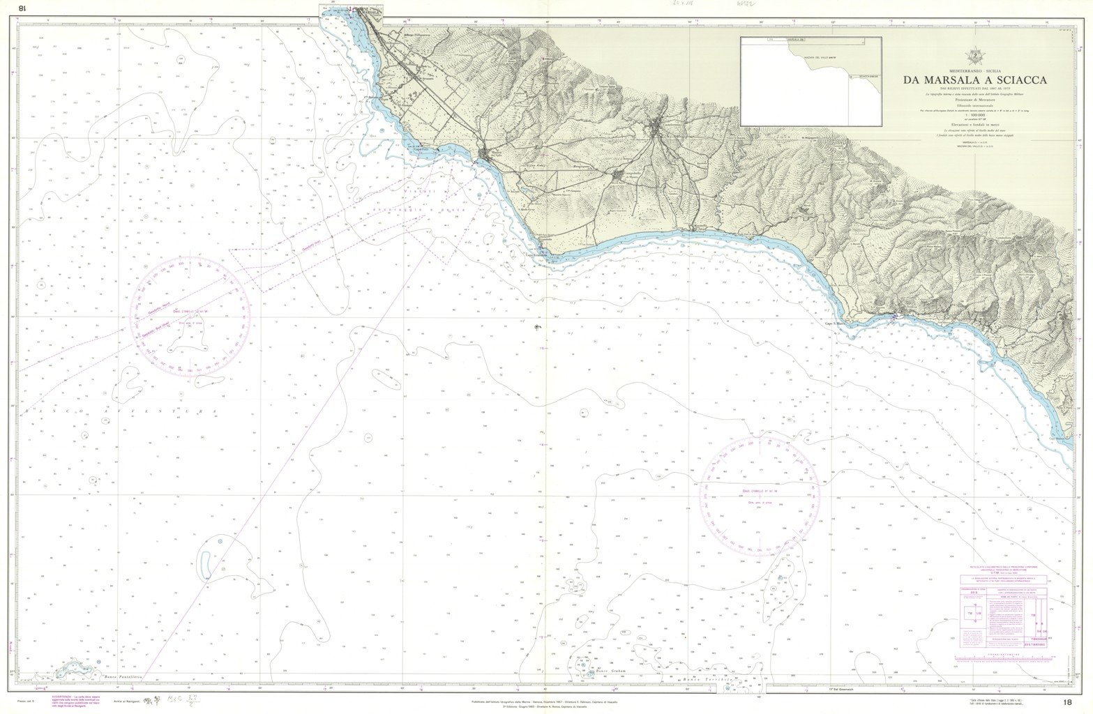 Carta nautica, di grandi dimensioni, del litorale da Marsala a Capo Bianco, ristampa del dicembre 1983, aggiornata nel febbraio 1973. Ricavata dai rilievi del 1887 fino a quelli del 1979. Pieghe editoriali