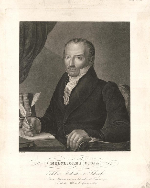Ritratto di Melchiorre Gioja, a muzzo busto, da un disegno di De Marchi tradotto a stampa da Cattaneo. Come riporta il titolo fu "Celebre Statistico e Filofoso. Nato a Piacenza ai 20 settembre dell'anno 1767. Morto in Milano li 2 Gennaio 1829". Alcuni segni del tempo