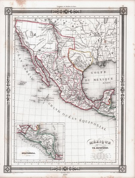 Mappa del Messico di Thunot Duvotenay; edizione del 1846, raffigurante il Texas come Repubblica. Duvotenay pubblicò diverse edizioni di questa carta del Messico - questa con la data del 1846 è la più desiderabile per la sua rappresentazione dell'effimera Repubblica del Texas. Illustrando tutto l'odierno Messico e gli Stati Uniti sud-occidentali, la mappa offre una serie di elementi affascinanti, tra cui i fiumi fittizi Jesus Maria e Wimmetchke, raffigurati mentre si estendono verso est dalla baia di San Francisco. Il Grande Lago Salato è indicato come Lago Teguayo, dal nome di Jose Antonio de Alzate y Ramirez, e secondo alcuni è la leggendaria patria degli Aztechi. A nord del lago Teguayo si trova quello che oggi è conosciuto come lago Utah, ma che qui è denominato come lago Timpanogos. Il Messico stesso è diviso nelle sue diverse province. Un inserto nel quadrante inferiore sinistro si concentra sul Guatemala. Preparata da Thunot Duvotenay per essere pubblicata nell'edizione del 1848 dell'Atlas Illustre pubblicato dalla casa editrice Maison Basset. La Maison Basset (1819 - 1865) è stata un'azienda editoriale francese attiva nella metà e nella fine del XIX secolo, fondata da André Basset (o Bassett), che iniziò a pubblicare mappe, stampe e libri intorno al 1768. La Maison Basset, o Chez Basset, è il marchio con cui gli eredi di Paul-André Basset (1785-1819) pubblicarono le opere di importanti cartografi e incisori francesi come Barbie du Bocage, A. Vuillemin, J. B. Charle, V. Levasseur, Tu. Duvotenay, H. Dufor, F. E. George e altri. La loro biblioteca di pubblicazioni è varia e vasta, ma fortemente incentrata su testi medici e scientifici, tra cui alcuni importanti atlanti. Thunot Duvotenay (1796 - 1875) è stato un geografo francese attivo a metà del XIX secolo. Thunot è noto per aver collaborato con molti altri importanti cartografi del suo tempo, tra cui Barbie du Bocage, Vuillemin, Charle, Levassseur e Dufour. Duvotenay pubblicò anche “Complement de L'Encyclopedie Moderne ou Dictionnaire Abrege des Sciences, des Lettres des Arts de l'Industrie, de l'Agriculture et du Commerce Atlas” (Parigi, 1875-1879) e atlanti di Francia, Svizzera e Stati Uniti. Incisione in rame con contorno originale a colori, alcune ossidazioni, per il resto buono stato di conservazione. 1846 Thunot Duvotenay map of Mexico, showing Texas as Republic. Duvotenay published several different editions of this Mexico map - this with the date 1846 is being the most desirable due to its depiction of the ephemeral Republic of Texas. Illustrating all of modern-day Mexico and southwest United States, the map offers a number of fascinating elements including the fictional rivers Jesus Maria and Wimmetchke, shown extending eastward from San Francisco Bay. The Great Salt Lake is labeled as Lake Teguayo, after Jose Antonio de Alzate y Ramirez, and is said by some to be the legendary homeland of the Aztecs. To the north of Lake Teguayo lies what we known today as Lake Utah, but here it is labeled Lake Timpanogos. Mexico itself is divided into its various intendancies. An inset in the lower left quadrant focuses on Guatemala. Prepared by Thunot Duvotenay for publication in Maison Basset's 1848 edition of ' Atlas Illustre Destine a l'enseignement de la Geographie elementaire. Maison Basset (1819 - 1865) was a French publishing concern active through the mid to late 19th century. The firm can trace their roots to André Basset (or Bassett) (fl. 1768 - 1784), who starting publishing maps, prints, and books around 1768. Maison Basset, also Chez Basset, is the imprint under which the heirs of Paul-André Basset (1785 - 1819) published the works of such prominent French cartographers and engravers as Barbie du Bocage, A. Vuillemin, J. B. Charle, V. Levasseur, Tu. Duvotenay, H. Dufor, F. E. George, and others. Their library of publications is diverse and vast, but heavily focused on medical and scientific texts, including several important atlases. Thunot Duvotenay (1796 - 1875) was a French geographer active in the mid 19th century. Thunot is known to have worked with several other important cartographers of his day including Barbie du Bocage, Vuillemin, Charle, Levassseur and Dufour. Duvotenay also published "Complement de L'Encyclopedie Moderne ou Dictionnaire Abrege des Sciences, des Lettres des Arts de l'Industrie, de l'Agriculture et du Commerce Atlas" (Paris, 1875-1879). and atlases of France, Switzerland & the United States. Copper engraving with original outline colour, some foxing, otherwise good condition. ' Cfr.
