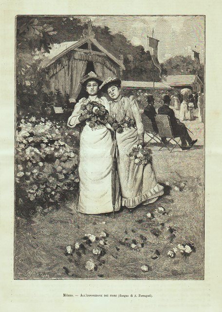 Rappresentazione di due graziose figure femminile con mazzi di fiori in mano all’Esposizione di floricultura. Testo al retro