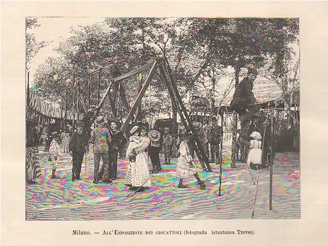 Veduta di un momento di gioco dei bambini all’Esposizione. Testo al retro