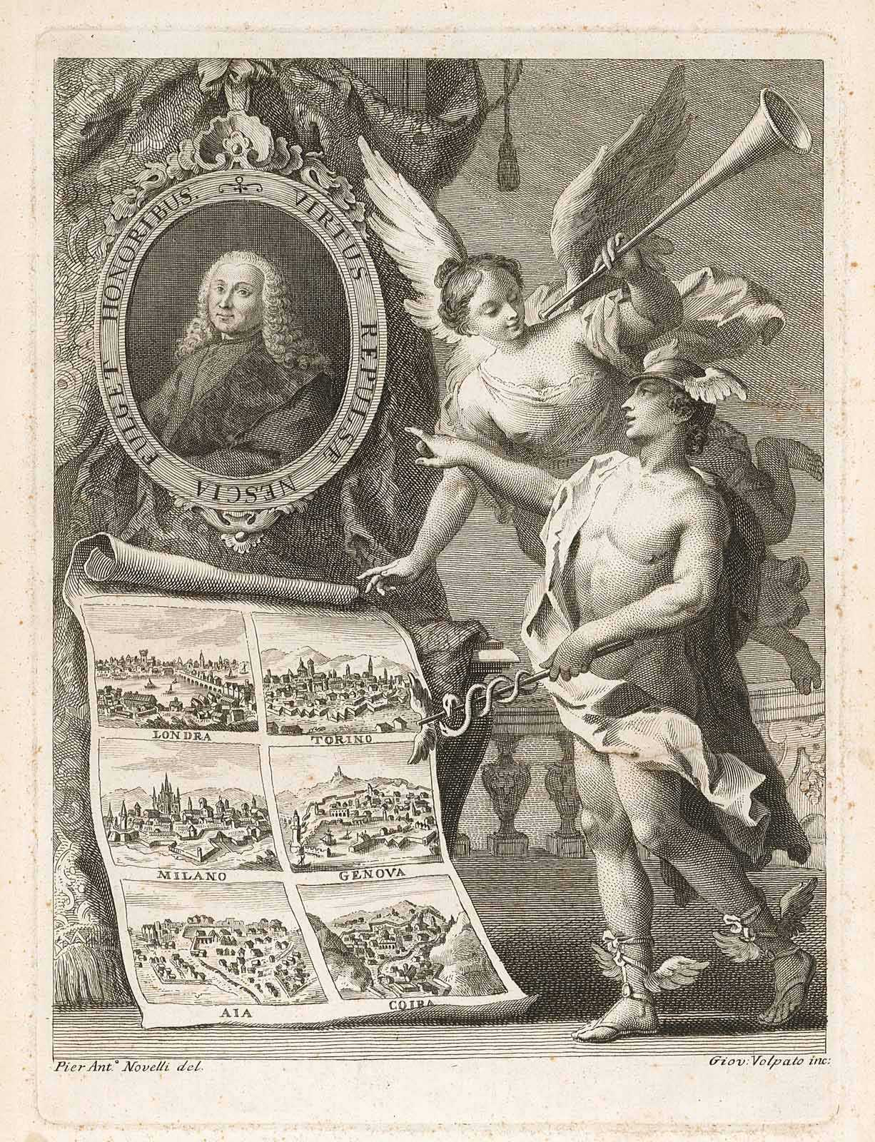 Pier Antonio Novelli del. Venezia 1729-1804 -- Giovanni Volpato Bassano 1735 - Roma 1803La composizione scenica raffiguara il ritratto di Lodovico Manin, ultimo Doge della Repubblica di Venezia, inserito in cornice in cui si legge "Virtus Repulsae Nescia Fulget Honoribus" che viene addidato dalla figura mitologica di Ermes, figlio di Zeus e della ninfa Maia, che impugna il bastone alato con intrecciati due serpenti, emblema del pronto soccorso. In basso entro stendardo le piantine planimetriche prospettiche delle città di: Londra, Torino, Milano, Genova, Aia e Coira