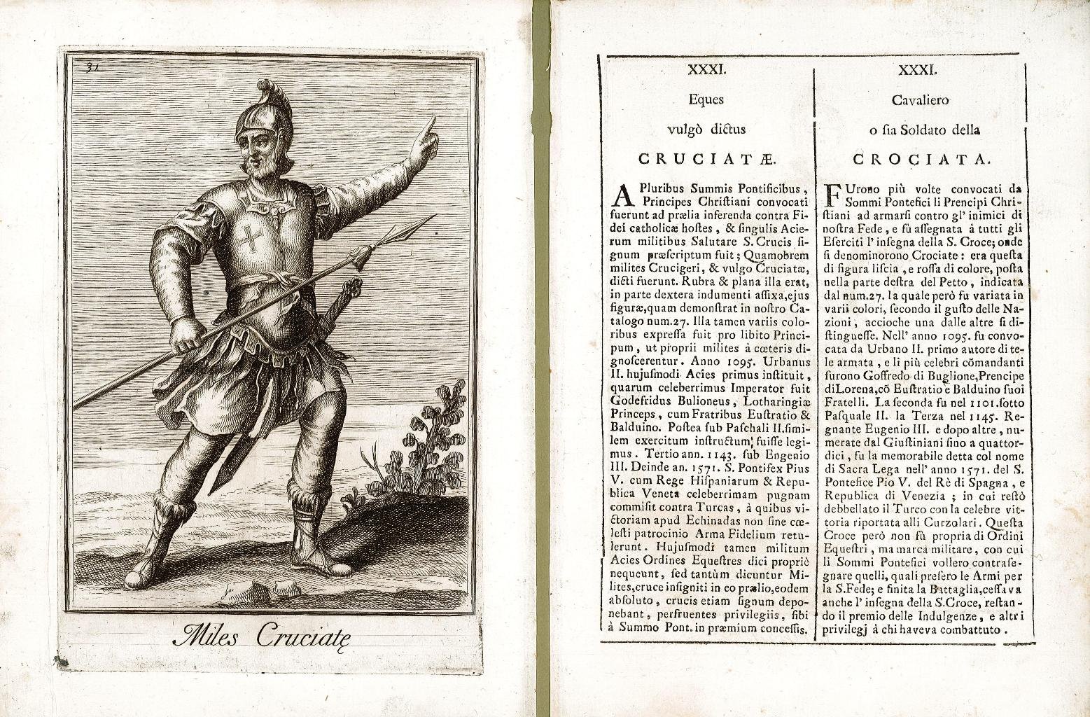 Incisione, antica ed originale, raffigurante il Cavaliere o Soldato della Crociata accompagnata da pagina descrittiva divisa su due colonne, a sinistra in latino ed a desta in italiano, con la storia del costume dell’ordine militare rappresentato. Inserita nell’opera “Catalogo degli ordini equestri e militari. Esposto in imagini, e con breve racconto offerto alla Santità di N.S. Clemente XI dal P. Filippo Bonanni della Compagnia di Giesu” In Roma MDCCXI – Nella Stamperia di Giorgio Placco Intagliatore, e Gettatore di Caratteri à S. Marco. Con licenza de’ Superiori