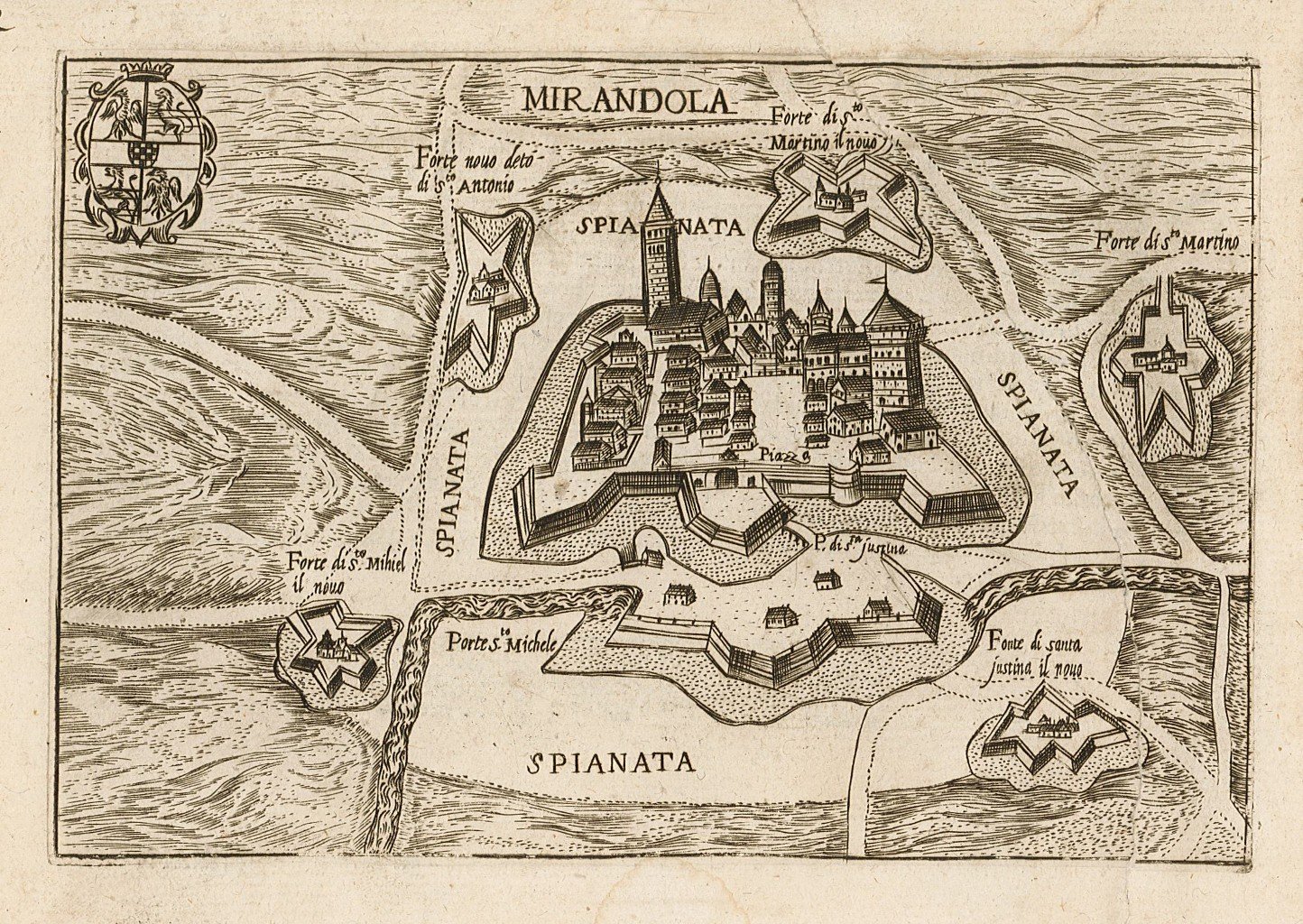 Stampa, antica ed originale, con pianta planimetrica prospettica della città. Restauro per strappo