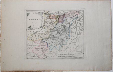 Pubblicata a Vienna da Franz Johann Joseph von ' Reilly nello ' Schauplatz der fünf Theile der Welt mit beständiger Rücksicht auf die besten Originalwerke in drey Theile zusammengetragen von einer Gesselschaft Geographen nach zu Büschings Grosser Erdbeschreibung. Reilly (1766-1820) pubblicò l’atlante al ritmo di una mappa a settimana per 17 anni dal giugno 1789 al luglio 1806, producendo, in totale, circa 830 mappe dell'Europa. Una terza parte dell'atlante era prevista per coprire il resto del mondo, ma non fu mai pubblicata. ' Come si deduce dal titolo dell'Atlante in cui la mappa è stata pubblicata la prima volta, l'autore del disegno è il cartografo tedesco Anton Friederich Büschings e l'incisore è Ignaz Albrecht'. L'Atlante fu pubblicato dal mercante d'arte viennese Franz Johann Joseph von Reilly (1766-1820) che tra il 1789 e il 1806 - proprio nel periodo delle campagne napoleoniche, quando i confini erano piuttosto labili- produsse almeno 830 mappe e quelle riguardanti l'Italia furono pubblicate tra l'agosto 1797 e il giugno 1799. Acquaforte, stampata su carta azzurra e con coloritura editoriale, in ottimo stato di conservazione. Published in Vienna by Franz Johann Joseph von Reilly in ' Schauplatz der fünf Theile der Welt mit beständiger Rücksicht auf die besten Originalwerke in drey Theile zusammengetragen von einer Gesselschaft Geographen nach zu Büschings Grosser Erdbeschreibung. Reilly (1766-1820) published the Atlas at the rate of one map per week for 17 years from June 1789 to July 1806, producing, in total, some 830 maps of Europe. A third part of the atlas was planned to cover the rest of the world, but was never published. As can be deduced from the title of the Atlas in which the map was first published, the author of the drawing was the German cartographer Anton Friederich Büschings and the engraver was Ignaz Albrecht. The Atlas was published by the Viennese art dealer Franz Johann Joseph von Reilly (1766-1820) who produced at least 830 maps between 1789 and 1806 - right in the period of the Napoleonic campaigns, when the borders were rather labile - and those concerning Italy were published between August 1797 and June 1799. Etching, printed on blue paper and with editorial colouring, in excellent condition. Cfr. Z. Davoli - R. Sanfelici - S. Zanasi ,"Terre di Langobardia", sch. 142