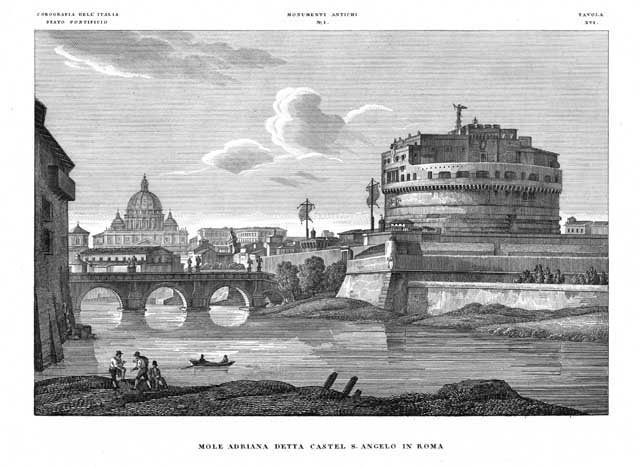 Veduta dell'antico mausoleo, il Tevere e alcuni personaggi, in primo piano