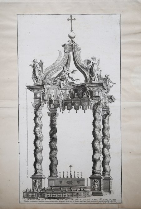 Titolo completo: Molis aeneae quam fusili artificio Urbanus VIII. Pont. Max. super S.S. Aposr. Petri et pauli : tumulum excitavit ornauiqueIoannes Laurentius Berninus Eques qui in Templo Vaticano opus perfecit hic de lineationem expressit.Acquaforte e bulino, 1650 circa, in basso a destra, nell’immagine, l’indirizzo editoriale: 'Gio Giacomo rossi Formi Roma alla Pace'. L’incisione mostra il celebre baldacchino di Gian Lorenzo Bernini, che fu commissionato da papa Urbano VIII nel 1624. La struttura è mostrata in prospettiva dalla navata della basilica. La scala dell'immagine è indicata sul lato sinistro della stampa: 'Scala palos Roma . 50.' Bell’esemplare, impresso su carta vergata coeva, rifilato al rame e applicato su supporto di collezione, in ottimo stato di conservazione. Title: Molis aeneae quam fusili artificio Urbanus VIII. Pont. Max. super S.S. Aposr. Petri et pauli : tumulum excitavit ornauiqueIoannes Laurentius Berninus Eques qui in Templo Vaticano opus perfecit hic de lineationem expressit.Etching and engraving, 1650 circa, below in the image, at right, the publisher’address 'Gio Giacomo rossi Formi Roma alla Pace' Good example, printed on contemporary laid paper, trimmed to the platemark and laid down on antique paper, in very good condition.The print shows an elevation of Gian Lorenzo Bernini's baldachin, which Pope Urban VIII commissioned in 1624. The ornamentation and sculptures of the baldachin are depicted in detail. The structure is shown in perspective from the nave of the basilica. The scale of the image on the print has been indicated on the left side of the print: 'Scala palos Roma . 50.' Cfr.