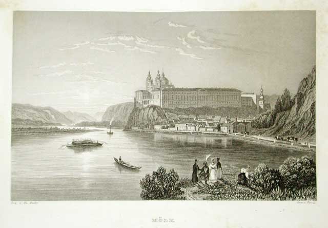 Veduta panoramica della cittadina, sita lungo il corso del Danubio. Personaggi in primo piano