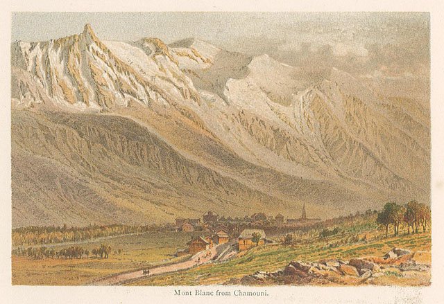 Veduta del Monte Bianco presa da Chamounix, tratta dall'opera " Mountains and Lakes of Switzerland and Italy ". Testo al retro