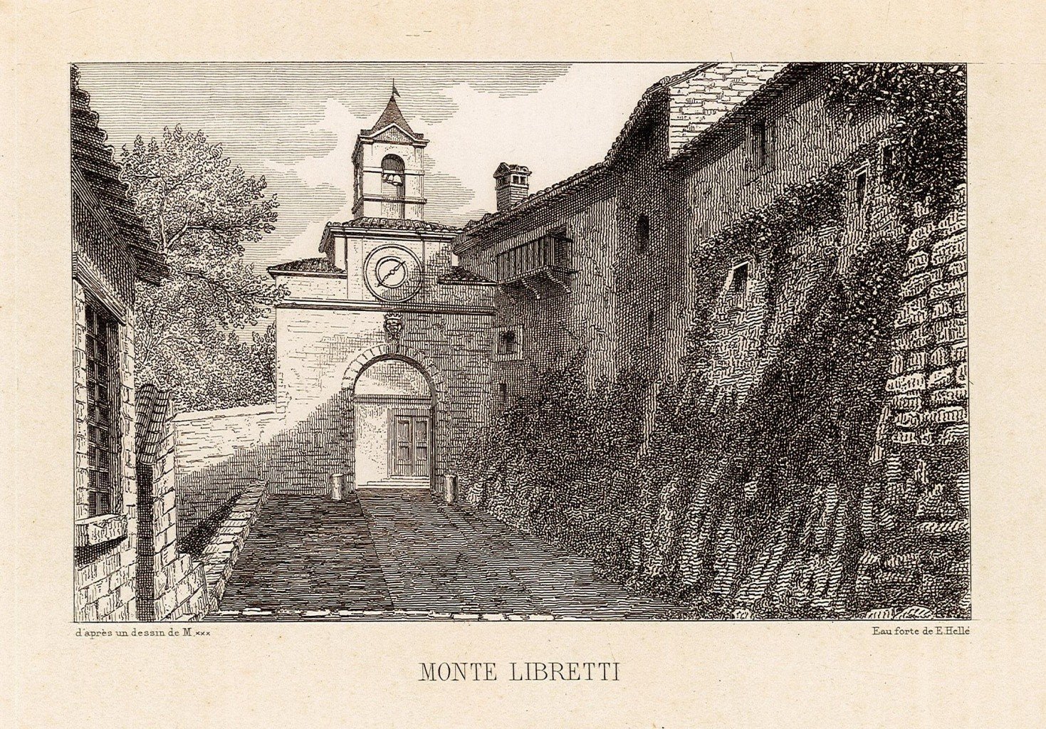 Graziosa veduta di uno scorcio del borgo di Montelibretti in provincia di Roma, incisa all'acquaforte da E. Helle