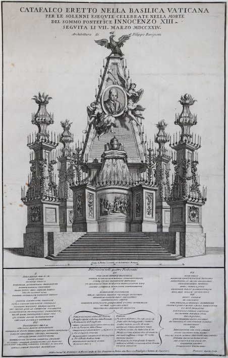 Acquaforte, 1724, firmata in lastra. Magnifica prova di questa rara incisione, impressa su carta vergata coeva, rifilata alla linea marginale, tracce di pieghe di carta visibili al verso, per il resto in ottimo stato di conservazione. L’opera raffigura il catafalco eretto a San Pietro nel marzo 1724, in occasione della morte di papa Innocenzo XIII. Dimensioni 350x560. Etching, 1724, signed on plate. Magnificent work, printed on contemporary laid paper, trimmed to platemark, signs of folds on verso, otherwise in good condition. The work depicts the coffin built in St. Peter on March 1724, when Pope Innocenzo XIII died. Cfr.