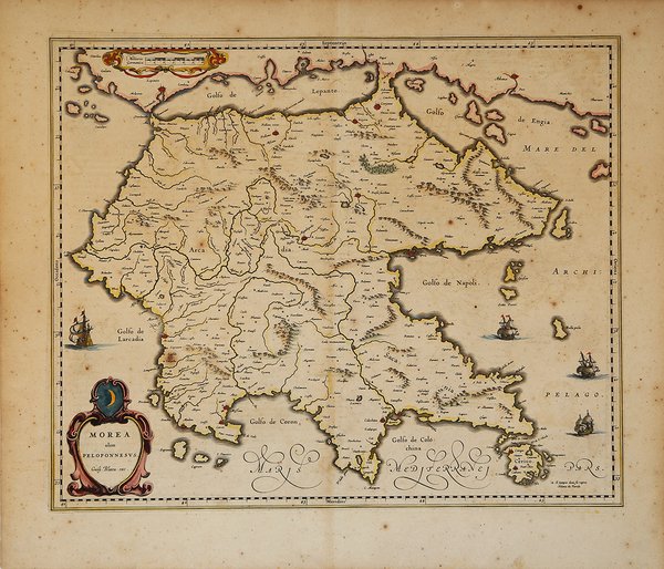 Classica carta geografica della Morea dall'Atlas Major del Blaeu. Willem Janszoon Blaeu, avviò nel 1599 la sua attività di costruttore di globi e strumenti astronomici ad Amsterdam. Nel 1630, dopo aver comprato alcune lastre dell’atlante del Mercator da Jodocus Hondius II, fu in grado di pubblicare un volume di 60 mappe con il titolo di ' Atlantis Appendix. Cinque anni dopo, pubblicò i primi due volumi del suo atlante ' Atlas Novus ' o ' Theatrum Orbis Terrarum, ' in sei libri. Dopo la sua morte, Joan (Johannes) continuò l’opera paterna, completando l’intera serie di sei volume dell’Atlas Novus ' intorno al 1655. Fu inoltre autore di un ' Atlas Maior sive Cosmographia Blaviana, in 12 volumi pubblicati nel 1662 -72, dei quali uno dedicato all'Italia. La carta compare per la prima volta nel terzo volume del ' Theatrum. ' Secondo Koeman viene pubblicata in primis nell'edizione francese del 1640, dal titolo ' Le Theatre du Monde ou Nouvel Atlas, ' Mis en lumiere par Guillaume & Jean Blaeu. ' Troisieme partie. A Amsterdam, Chez Iean & Corneille Blaeu MDCXL. Il terzo volume del ' Theatrum ' contiene 58 carte dell'Italia e 4 della Grecia (cfr. Koeman, ' Atlas Neerlandici, pp. 160-162, Bl 35A). Le carte dell'italia derivano tutte dall'opera di Giovanni Antonio Magini. Tuttavia, sembra più probabile che il Blaeu si basi sue quelle di Hendrick Hondius e Johannes Janssonius pubblicate nel ' Theatrum Italiae in quo Eius Regna, Domina, Ducatus, Et Speciatim Illorum Provinciae, Tabulis Accuratissimis, Iam, De Novo in Lucem Editio, Describunter, Quorum Sequens Pagina Indicabit, stampato ad Amsterdam da Hendrick Hondius nel 1636. ' Sebbene pubblicate dopo la morte di Willem Janszoon Blaeu (1638) le carte spesso recano il suo imprint. Non è dato sapere se fossero tutte già pronte o sei i figli Johannes e Cornelis le compilarono postume. Incisione in rame, coloritura coeva, leggere ossidazioni, per il resto in ottime condizioni. The Peloponnesos peninsula in southern Greece was called Morea well into the 19th century. The narrow isthmus between the mainland and the peninsula on this map was bisected by the Corinth Canal, built in 1893, effectively turning the Peloponnesos peninsula into an island. The map is adorned with decorative strapwork cartouches and four sailing ships. Latin text on verso. Willem Janszoon Blaeu, started in 1599 his business as a builder of globes and astronomical instruments in Amsterdam. In 1630, after buying some plates of the Mercator atlas from Jodocus Hondius II, he was able to publish a volume of 60 maps under the title ' Atlantis Appendix. Five years later, he published the first two volumes of his atlas ' Atlas Novus ' or ' Theatrum Orbis Terrarum, in six books. After his death, Joan (Johannes) continued his father's work, completing the entire six-volume ' Atlas Novus ' series around 1655. He was also the author of an ' Atlas Maior sive Cosmographia Blaviana, in 12 volumes published in 1662 -72, one of which was devoted to Italy. The map first appears in the third volume of the ' Theatrum. According to Koeman it is first published in the French edition of 1640, entitled ' Le Theatre du Monde ou Nouvel Atlas, Mis en lumiere par Guillaume & Jean Blaeu. Troisieme partie. In Amsterdam, Chez Iean & Corneille Blaeu MDCXL. The third volume of the ' Theatrum ' contains 58 maps of Italy and 4 of Greece (see Koeman, ' Atlas Neerlandici, pp. 160-162, Bl 35A). The maps of Italy are all derived from the work of Giovanni Antonio Magini. However, it seems more likely that Blaeu relies on those of Hendrick Hondius and Johannes Janssonius published in ' Theatrum Italiae in quo Eius Regna, Domina, Ducatus, Et Speciatim Illorum Provinciae, Tabulis Accuratissimis, Iam, De Novo in Lucem Editio, Describunter, Quorum Sequens Pagina Indicabit, ' printed in Amsterdam by Hendrick Hondius in 1636. Although published after the death of Willem Janszoon Blaeu (1638) the maps often bear his imprint. It is not known whether they were all ready-made or if his sons Johannes and Cornelis completed them posthumously. Cfr. Zacharakis C. G. "A Catalogue of Printed Maps of Greece 1477 - 1800" (2009), n. 385