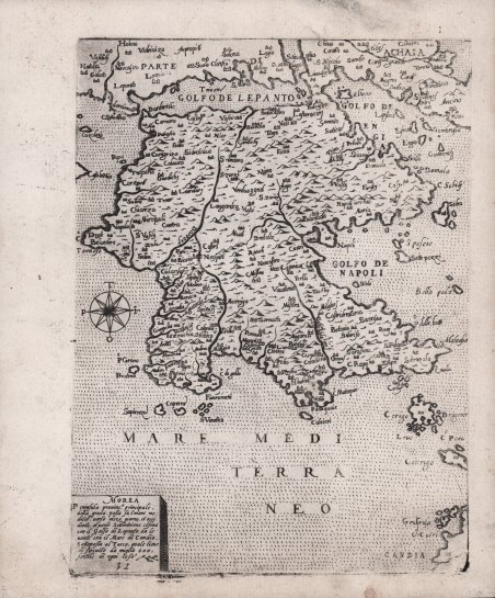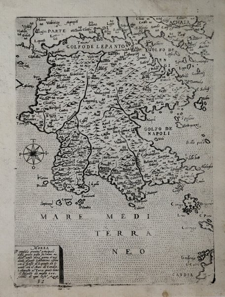 Rara carta della Morea edita a Venezia da Camocio, parte del celebre "Isole Famose" di Camocio.Tra il 1560 ed 1575 Camocio pubblicò circa quaranta carte di grande formato e molte furono le carte di piccolo formato pubblicate sciolte tra il 1566 e il 1574, che andarono successivamente a formare il volume noto col nome "Isole famose, porti, fortezze e terre marittime sottoposte alla Serenissima Signoria di Venetia, ed altri Principi Christiani, et al Signor Turco, nouamente poste in luce. In Venetia alla libreria del segno di San Marco". Le carte inserite nell’isolario di Camocio hanno la lastra ritoccata e un numero sequenziale aggiunto, mentre le prime prove sono caratterizzate dalla grande qualità di stampa e dall’assenza del numero. Gli esemplari con la numerazione sono, invece, quelli inseriti nelle edizioni dell'isolario edite da Donato Bertelli - imprint In Venetia alla libreria del segno di San Marco. Tale edizione, sebbene priva di data, risale a dopo il 1575, anno in cui il Camocio scomparve durante l'epidemia di pestilenza a Venezia e gran parte della sua tipogrfaia fu acquisita dal Bertelli.Raro primo stato, avanti la numerazione. Acquaforte e bulino, in buono stato di conservazione.Bibliografia: S. Bifolco, Città e Fortezze Principali del Mondo, in Bifolco-Ronca "Cartografia e Topografia Italiana del XVI secolo. Catalogo ragionato delle opere a stampa" (2018), pp. 126, 140-141. Rare first state before the number. From Camocio's "Isole Famose".This work, as was usual for Camocio and his other contemporary publishers, was on the market as loose map and later included in the "Isole famose, porti, fortezze e terre marittime sottoposte alla Serenissima Signoria di Venetia, ed altri Principi Christiani, et al Signor Turco, nouamente poste in luce. In Venetia alla libreria del segno di San Marco". The issue with the numbers are, instead, those inserted in the editions of the book published by Donato Bertelli - showing the imprint In Venetia alla libreria del segno di San Marco. This edition, although without date, dates back to after 1575, the year in which the Camocio disappeared during the pestilence epidemic in Venice and much of its typography was acquired by Bertelli.Etching with engraving, in good condition.Bibliografia: S. Bifolco, Città e Fortezze Principali del Mondo, in Bifolco-Ronca "Cartografia e Topografia Italiana del XVI secolo. Catalogo ragionato delle opere a stampa" (2018), pp. 126, 140-141. Cfr. Gallo (1950): p. 97, n. 32; Tolias (2011): n. 0384; Zacharakis (1992): n. 503; Zacharakis (2009): n. 775.