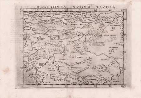 Moderna mappa di Girolamo Ruscelli della Russia europea, che mostra la regione a nord del Mar Nero e del Mar Caspio e sezionata dal fiume Volga, con Mosca vicino al centro. Una delle prime mappe moderne ottenibili della Russia. Carta tratta dalla ' Geographia di Claudio Tolomeo, a cura di Girolamo Ruscelli, pubblicata in Venezia in più edizioni tra il 1561 ed il 1598. La carta è basata sulla “Geografia” di Giacomo Gastaldi (1548), che probabilmente disegnò personalmente anche queste mappe, che vennero incise dai fratelli Livio e Giulio Sanuto. La peculiarità di queste mappe è che sono incise due per lastra e successivamente tagliate; questo il motivo per cui il segno del rame appare solo in tre lati della mappa. Il testo del Ruscelli e le sue carte sono considerate come il miglior atlante moderno fino alla prima versione del ' Theatrum ' ' Orbis Terrarum ' di Abraham Ortelius (1570). Solo la loro larga diffusione ne impedisce una valutazione sostenuta nel mercato antiquario. L'opera infatti ebbe una prima stesura nel 1561, stampata da Vincenzo Valgrisi che ne curò anche la ristampa del 1562. Tre sono le edizioni firmate da Giordano Ziletti (due nel 1564 e una del 1574), mentre nel 1597 viene edita dai fratelli Calignani. Tutte queste edizioni contengono 64 tavole. Nel 1598 e 1599 vengono alla luce le due edizioni curate da Giuseppe Rosaccio e stampate dagli Eredi di Melchior Sessa. Queste ultime due edizioni comprendono 69 tavole; sono infatti aggiunte la carta del planisfero e dei continenti di Rosaccio. Acquaforte e bulino, finemente colorata a mano, ' in ottimo stato di conservazione. Fine example of Ruscelli's modern map of European Russia, showing the region north of the Black and Caspian Seas and dissected by the Volga River, with Moscow near the center. One of the earliest obtainable modern maps of European Russia. Map taken from ' Geographia di Claudio Tolomeo ' edited by Girolamo Ruscelli, published in Venice in several editions between 1561 and 1598. The maps is based on the ' Geografia ' by Giacomo Gastaldi (1548), who probably also personally drew these maps, which were engraved by the brothers Livio and Giulio Sanuto. The peculiarity of these maps is that they are engraved two for plate and subsequently cut; this is why the copper sign only appears on three sides of the map. Ruscelli's text and his maps are considered to be the best modern atlas up to the first version of Abraham Ortelius' ' Theatrum Orbis Terrarum ' (1570). Only their widespread diffusion prevents a sustained evaluation in the antiquarian market. In fact, the work had a first edition in 1561, printed by Vincenzo Valgrisi who also edited the 1562 reprint. There are three editions signed by Giordano Ziletti (two in 1564 and one in 1574), while in 1597 it was published by the Calignani brothers. All these editions contain 64 plates. In 1598 and 1599 the two editions edited by Giuseppe Rosaccio and printed by the heirs of Melchior Sessa came to light. These last two editions include 69 plates; in fact, Rosaccio's map of the planisphere and continents has been added. Etching and engraving, fine later hand colour, in good condition. Cfr.