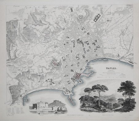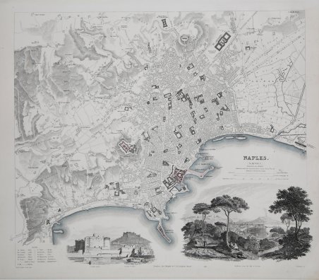 Una bella mappa preparata per l'Atlante della S.D.U.K. La Society for the Diffusion of Useful Knowledge, o S.D.U.K., come era conosciuta, produceva mappe a basso costo per incoraggiare un ampio uso nell'istruzione. Le mappe contenute in questi due volumi furono pubblicate in parte nel corso di diversi anni. Di particolare interesse sono le piante delle città, con vignette e grandi dettagli. Il loro atlante più importante consisteva in circa 200 mappe emesse separatamente, inizialmente pubblicate da Baldwin e Cradock e vendute per abbonamento dal 1829 al 1844. In seguito, la Società riunì le mappe in un unico atlante mondiale pubblicato con il marchio Chapman and Hall. All'epoca, questo atlante era senza precedenti per qualità, portata e convenienza. Oggi le mappe della Society, o S.D.U.K. come viene comunemente chiamato, sono tra gli esempi più importanti dell'editoria cartografica popolare inglese della metà del XIX secolo. La S.D.U.K. è nota soprattutto per le sue bellissime e accuratamente dettagliate piante di città. Le carte vennero incise da J. & C. Walker. Incisione in acciaio con contorno a colori coevo, ottimo stato di conservazione. A nice map prepared for the Atlas of the S.D.U.K. The Society for the Diffusion of Useful Knowledge, or S.D.U.K., as the Society was known, produced inexpensive maps to encourage broad use in education. The maps in these two volumes were issued in parts over several years. The city plans are of particular interest, with vignettes and great detail. Their most important atlas consisted of some 200 separately issued maps, initially published by Baldwin and Cradock and sold by subscription from 1829 to 1844. Later, the Society combined the maps into a single world atlas published under the Chapman and Hall label. At the time, this atlas was unprecedented in quality, scope, and affordability. Today, the Society's maps, or S.D.U.K. as it is commonly called, are among the most impressive examples of mid-nineteenth-century English mass cartographic publishing. S.D.U.K. is best known for its beautiful and accurately detailed city plans. The first edition being published by Baldwin and Cradock, with the maps issued in numbers and later bound as a set. Engraved by J. & C. Walker. Published by the Society for the Diffusion of Useful Knowledge, 59 Lincolns Inn Fields, Novr. 26th. 1838. (London: Chapman & Hall, 1844). Steel-engraving with contemporary outline colour, good condition. Cfr.