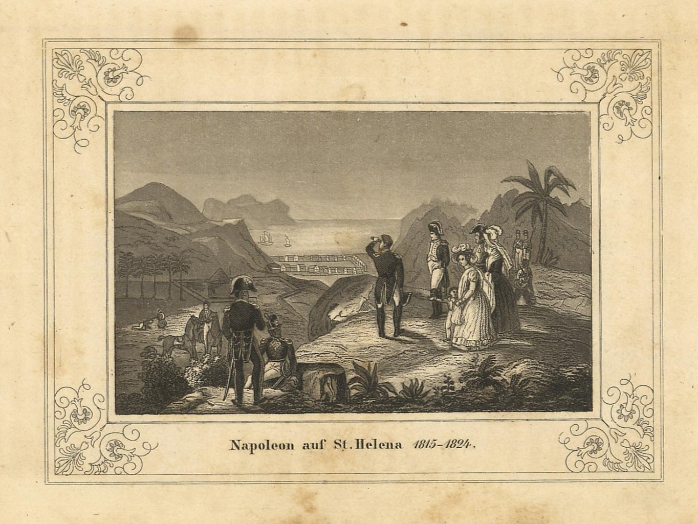 Piccola incisione, antica ed originale, entro decorativa cornice. Autore: Moritz fec. Luogo: Sant Elena. Anno: 1848. Tecnica: acquatinta. Dimensioni: 78x109.