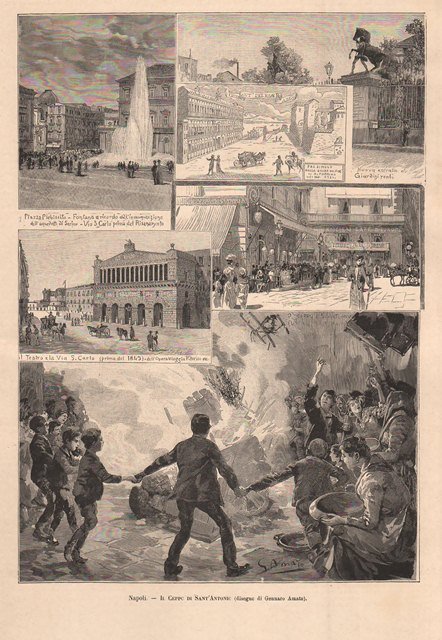 La composizione mostra la veduta di piazza Plebiscito, l’entrata ai giardini reali, il Teatro e la via San Carlo e il momento in cui i ragazzi ballano intorno al fuoco acceso dai popolani in onore di Sant’Antonio Abate, festeggiato il 17 gennaio. Testo al retro