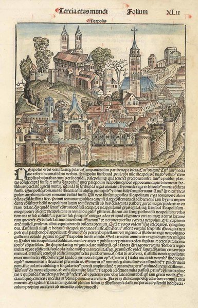 Fantasiosa ma simbolica raffigurazione di Napoli che costituisce un tassello fondamentale nella storia iconografica della città. La veduta fu inserita nel "Registrum huius operis libri cronicarum." stampato a Norimberga nel 1493 e meglio conosciuto come "Cronaca di Norimberga". L'incisione è caratterizzata da una delicata e pregevole coloritura coeva. Il foglio presenta un restauro molto eseguito lungo il margine destro che non compromette l'ottimo stato di conservazione generale di questo incunabolo della raffigurazione vedutistica partenopea. Misura del foglio 450x270 mm