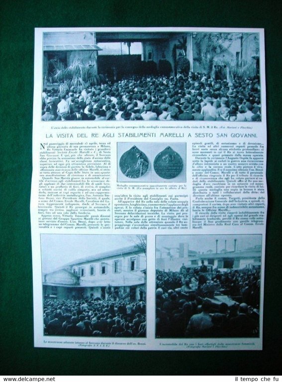 Rara Stampa Estratta da Rivista d'epoca del 1922 Nel 1922 La visita del Re Vittorio Emanuele III di Savoia agli stabilimenti Marelli a Sesto San Giovanni. L'atrio dello stabilimento durante la cerimonia per la consegna della medaglia commemorativa della visita di S. M. il Re Vittorio Emanuele III di Savoia medaglia commemorativa appositamente coniata per la visita di S. M. le maestranze adunate intorno al Sovrano durante il discorso dell'on. Benni l'automobile del Re Vittorio Emanuele III di Savoia con i fiori offertigli dalle maestranze femminili + Echi della visita del Re Vittorio Emanuele III di Savoia a Milano. Il Re Vittorio Emanuele III di Savoia col sindaco socialista di Arese la visita al Touring alla fiera campionaria col presidente sen. Nava alla Camera di Commercio gli allievi delle scuole di Sesto San Giovanni accamano il Sovrano la rivista militare nella caserma Principe Eugenio allo stand Bertelli alla Fiera campionaria. II1922-05 Dimensioni Cm 24,00 x 34,00 + 24,00 x 34,00 Qualora vogliate delle scansioni migliori contattateci, soddisferemo ogni vostra richiesta. PaypalCarta di creditoBonifico bancario Accuratamente adagiate su un cartoncino e protette da pellicola trasparente rigida,il tutto viene inserito dentro plico di adeguate dimensioni per proteggerne l'integrità.