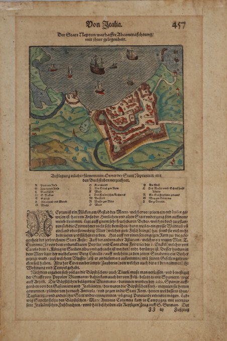 Tavola tratta dalla ' Cosmographiae Universalis, edizione in tedesco, Basilea, seconda metà del XVI secolo.La ' Cosmographiae Universalis ' di Sebastian Münster (1488-1552), stampata per la prima volta Basilea nel 1544 dall’editore Heinrich Petri, venne più volte aggiornata e aumentata di nuove carte geografiche e rappresentazioni urbane nelle sue numerose edizioni che arrivano all’inizio del secolo successivo. Münster aveva lavorato a raccogliere informazioni al fine di ottenere un'opera che non deludesse le aspettative e, dopo un'ulteriore pubblicazione in tedesco abbellita da 910 stampe su legno, giunse nel 1550 all'edizione definitiva in latino, illustrata da 970 silografie. Vi furono poi numerose edizioni in diverse lingue, fra cui latino, francese, italiano, inglese e ceco. Dopo la sua morte di Münster (1552), Heinrich Petri prima, e il figlio Sebastian poi, continuarono la pubblicazione dell’opera. La ' Cosmographia universalis ' fu uno dei libri più popolari e di successo del XVI secolo, e vide ben 24 edizioni in 100 anni: l'ultima edizione tedesca venne pubblicata nel 1628, molto tempo dopo la morte dell'autore. La ' Cosmographia ' conteneva non solo le ultime mappe e vedute di tutte le città più famose, ma anche una serie di notizie enciclopediche di dettagli relative al mondo conosciuto, e sconosciuto. Il particolare successo anche commerciale di quest'opera fu dovuto in parte alle belle incisioni (tra i cui autori si possono citate Hans Holbein il Giovane, Urs Graf, Hans Rudolph Manuel Deutsch, David Kandel). Silografia, bella coloritura a mano, in buone condizioni. Plate taken from the ' Cosmographiae Universalis, German edition, Basel, second half of the 16th Century. The ' Cosmographiae Universalis ' of Sebastian Münster (1488-1552), printed for the first time in Basel in 1544 by the publisher Heinrich Petri, was updated several times and increased with new maps and urban representations in its many editions until the beginning of the next century. Münster had worked to collect information in order to obtain a work that did not disappoint expectations and, after a further publication in German embellished with 910 woodblock prints, arrived in 1550 to the final edition in Latin, illustrated by 970 woodcuts. There were then numerous editions in different languages, including Latin, French, Italian, English and Czech. After his death in Münster (1552), Heinrich Petri first, and then his son Sebastian, continued the publication of the work. The ' Cosmographia universalis ' was one of the most popular and successful books of the 16th century, and saw as many as 24 editions in 100 years: the last German edition was published in 1628, long after the author's death. The ' Cosmographia ' contained not only the latest maps and views of all the most famous cities, but also a series of encyclopedic details related to the known, and unknown, world. The particular commercial success of this work was due in part to the beautiful engravings (among whose authors can be mentioned Hans Holbein the Younger, Urs Graf, Hans Rudolph Manuel Deutsch, David Kandel). Woodcut, beautiful hand-coloring, in good condition. Cfr.