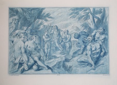Acquaforte e tinta allo zolfo stampata in azzurro, firmata in lastra in basso a destra. Da un soggetto di Bartolomeo Spranger.Magnifica prova, impressa su carta vergata coeva, rifilata al rame in perfetto stato di conservazione.L'opera fa parte della raccolta 'Disegni originali d'eccellenti pittori esistenti nella R.Galleria di Firenze', edita a Firenze nel 1766. Le 100 tavole che la compongono, riproducono disegni di grandi maestri. Iniziata dallo Scacciati, che relaizza le prime 67 incisioni, viene terminata dal suo allievo Andrea Mulinari. Etching with suplhur tone printed in blue, signed at lower right.After Bartolomeo Spranger.A fine impression, printed with tone, on contemporary laid paper, perfect condition.This work is part of the 'Disegni originali d'eccellenti pittori esistenti nella R.Galleria di Firenze', 1766 (plates 1-66 by Scacciati, 67-100 by Mulinari). Cfr.