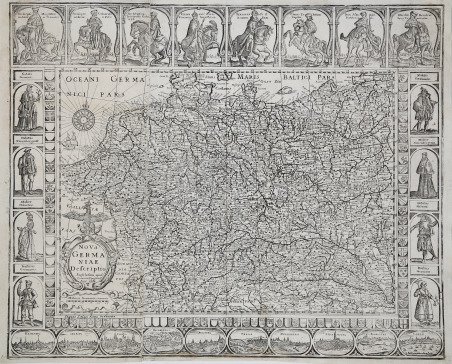 Nova Germaniae descriptio. Amstelodami apud Ioannem Ianssoniu[m] anno 1660. Eccellente carte-à-figures della Germania, comprendente anche parte delle Fiandre e di Svizzera, Italia, Polonia, Boemia e Ungheria, oltre che la raffigurazione delle principali città e borghi. Si tratta di una copia pirata della mappa di Pieter van der Keere (Kaerius) del 1615, esattamente della sua terza edizione pubblicta nel 1631 da Johannes Janssonius (cfr. Schilder MCN, VI, n. 33.3). Le vignette lungo i margini destro e sinistro raffigurano diversi modelli regionali e sociali, mentre quelle lungo i margini superiore e inferiore raffigurano vedute e piante delle città tedesche situate lungo i confini. Nel margine superiore è inserito anche un ritratto equestre di Ferdinando II, Santo Imperatore Romano e Re di Boemia, insieme ad altri duchi e arcivescovi con i loro rispettivi stemmi araldici nella parte superiore. Gunther Shilder, nell'introduzione alla sua cartobibliografia delle carte olandesi in folio con bordi decorativi (talvolta definite carte-à-figures, o “carte a pannelli”), ha commentato: “questo genere deve essere considerato uno dei migliori prodotti dell'industria cartografica di Amsterdam. La combinazione vincente tra i progressi delle conoscenze geografiche e l'espressione delle capacità artistiche fece di queste mappe un bene prezioso sia sul mercato nazionale che su quello internazionale” (cfr. Günter Schilder, Monumenta Cartographica Neerlandici VI. "Nederlandse foliokarten met decoratieve randen, 1604-1640”. Il fatto che molte di queste mappe venissero vendute in fogli separati e inserite solo casualmente negli atlanti compositi dell'epoca ne spiega la rarità odierna, mentre il loro fascino estetico non è diminuito nel corso dei secoli, rendendole esempi altamente collezionabili dell'arte cartografica. Questa carta della Germania era ignota a Klaus Stopp, riconosciuto come la maggiore autorità in materia di carte-à-figures. Un esemplare di questa mappa (e di altre anonime carte-à-figures italiane) privo di data ed indicazioni editoriali è stato venduto all’asta, presso Sotheby's Londra, nel novembre del 2008 (lotto 162 e seguenti). Il catalogatore (all’epoca Catherine Slowther, Sotheby’s Senior Specialist), seppure in maniera dubitativa, attribuì la carta a Stefano Mozzi Scolari, datandola al 1642 circa. L’ipotesi, più che attendibile, veniva basata sulla carta utilizzata per la mappa, una carta italiana come documentato dalla presenza della filigrana: “Seven of the maps following are hitherto unrecorded piracies taken from Dutch models by Pieter van den Keere or Jodocus Hondius Jr (re-)published by Johannes Janssonius in the 1630s and 1640s; one feature of the copying process is that the vast majority of the vignettes and costume figures, as also the armorials on the map of Germany, are reversed in engraving so what was on the left in the original now appears on the right. While this is commonly encountered for decorative features in maps, it is incongruous on the London plan, for example, to see the Tower of London placed on the west side of London and Westminster on the east. (However, all the vignettes on the map of France and three on that of Europe – Venice, Rome and Constantinople – are correctly orientated). Although copied from Dutch models, and assuming the engraved dates of 1641 or 1642 are broadly correct for the publication date of the set, it should be noted that the examples of the maps used were not acquired contemporaneously; the maps of the continents, for example were issued by Janssonius in 1632 with the lower panel removed. It is possible that these maps were engraved in Venice (the plan of Venice being one of the few vignette insets correctly orientated), perhaps by the little known publisher Stefano Scolari, who is known to have published other maps from Dutch originals, but as the maps are without any engraved attribution, this must be speculative. . Excellent map-à-figures of Germany, also including parts of Flanders and Switzerland, Italy, Poland, Bohemia and Hungary, as well as depictions of major cities and towns. This is a pirated copy of Pieter van der Keere's (Kaerius) map of 1615, exactly its third edition published in 1631 by Johannes Janssonius (see Schilder MCN, VI, no. 33.3). The vignettes along the left and right margins depict various regional and social patterns, while those along the upper and lower margins depict views and plans of German cities located along the borders. Also included in the upper margin is an equestrian portrait of Ferdinand II, Holy Roman Emperor and King of Bohemia, along with other dukes and archbishops with their respective heraldic coats of arms at the top. Gunther Shilder, in the introduction to his cartobibliography of Dutch folio maps with decorative borders (sometimes referred to as carte-à-figures, or "panel maps"), commented, "this genre must be regarded as one of the best products of the Amsterdam cartographic industry. The successful combination of advances in geographical knowledge and the expression of artistic skills made these maps a valuable commodity in both the domestic and international markets" (see Günter Schilder, Monumenta Cartographica Neerlandici VI. "Nederlandse foliokarten met decoratieve randen, 1604-1640." The fact that many of these maps were sold in separate sheets and included only casually in the composite atlases of the time explains their rarity today, while their aesthetic appeal has not diminished over the centuries, making them highly collectible examples of cartographic art. This map of Germany was unknown to Klaus Stopp, recognized as the foremost authority on carte-à-figures. A specimen of this map (and other anonymous Italian carte-à-figures) devoid of date and editorial indications was sold at auction, at Sotheby's London, in November 2008 (lot 162 et seq.). The cataloguer (at the time Catherine Slowther, Sotheby's Senior Specialist), albeit dub