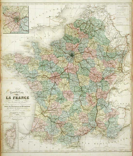 Carta geografica della Francia, con i vari dipartimenti evidenziati in coloritura coeva. Al lato sx., due riquadri con il dipartimento di Parigi, e l'isola della Corsica
