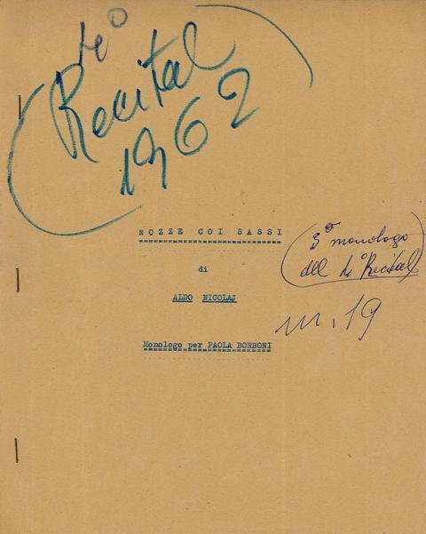 Copione dattiloscritto "Nozze coi sassi" di Aldo Nicolaj, Monologo per Paola Borboni in 6 fogli. Copertina cartonata marrone, in prima pagina firma autografa di Paola Borboni, diverse correzioni con tagli ed aggiunte