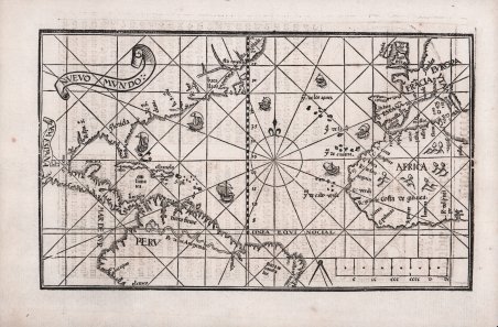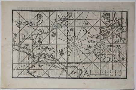 - RARISSIMA PRIMA EDIZIONE – Xilografia, 1545. Esemplare di primo stato, appartenente alla rarissima prima edizione dell’ ' Arte de Navegar ' stampata a Valladolid nel 1545, prima del taglio della lastra e della cancellazione di 8 linee dei radianti. Magnifica prova, impressa su carta vergata coeva, con margini, in perfetto stato di conservazione. Pedro de Medina era un clerico, per un tempo bibliotecario al servizio del Duca di Medina-Sidonia. Nominato cosmografo reale di Spagna, fu incaricato da Carlo V di preparare carte nautiche utili alla navigazione. La sua opera più celebre, ' Arte de Navegar, ' è un testo fondamentale della navigazione del XVI secolo, ed è uno dei tre libri di navigazione che usò Sir Francis Drake per il suo viaggio nel 1554. Il libro ebbe una enorme importanza e fu tradotto in tedesco, francese, inglese ed italiano, in più edizioni dal 1548 al 1568. L’edizione originale di Valladolid del 1545 è di estrema rarità; sul mercato antiquario solo due esemplari risultano venduti negli ultimi 40 anni ed una copia perfetta del libro è stata venduta da Christie’s New York per oltre mezzo milione di dollari. La mappa, unica carta nautica nel libro, talvolta descritta come un mappamondo è in realtà una carta nautica dell’oceano Atlantico, con le coste occidentali dell’Europa e quelle orientali del Nuovo Mondo. Questo primo stato della tavola fu intagliato in un unica matrice di legno, mentre gli esemplari che compaiono nelle successive edizioni dell’opera sono realizzate con l’uso di due matrici lignee. Rappresenta uno dei pochi prodotti della cartografia spagnola del XVI secolo e mostra 16 linee radiali. Le informazioni sul Nuovo Mondo derivano direttamente dal viaggio di Cortes, con il quale il Medina aveva viaggiato. La carta mostra le rotte commerciali e per la prima volta viene rappresentata la linea di demarcazione Papale che divideva l’America in Terra dei Portoghesi, ad Est, e Terra dei Spagnoli, ad Ovest. La mappa venne aggiornata a partire dal 1548, usando una seconda matrice lignea che estendeva la carta a tutto il Sud America. Gli esemplari di primo stato della mappa sono, pertanto, rarissimi. “In 1545 Pedro de Medina published his Art of Navigation which became a fundamental work on the subject. Of interest to us is its map of the Atlantic. His knowledge of the New World was first hand, having travelled with Cortés. Later he held the position of debriefing the returning crews from their voyages. The map depicts the trade routes to and from Spain and her possessions by the use of ships heading south-westerly on the outward bound journey and returning via the Gulf Stream to the north-east. The Papal demarcation line dividing the Americas between Portugal (the land to its east) and Spain (to its west) runs vividly through the map, illustrating for the first time the future influence that the former was to have over the country we know of as Brazil. Central America and particularly the Isthmus of Panama are shown remarkably accurately, and the Yucatan is shown correctly as a peninsula. R. Spu. S. is depicted following Hernando de Soto's epic voyage of exploration through the south, 1539-43. The eastern seaboard is beginning to show some features but they are not easily distinguished. A clearly identifiable Gulf of St. Lawrence begins to take shape following the voyages of Jacques Cartier. The second appearance of this map was in the first edition of Libro de grandezas . de España published in Seville, 1548, with one notable difference. In this edition, and the subsequent one of the same title in 1549 only, there appeared a second woodcut which was printed below the American half of the map and extended its coverage to the Strait of Magellan. To accommodate this the lower border of the left hand side has been removed and is not seen again. There were further editions of the Libro published in Alcalá de Henares, 1566 and 1568, issued without this extension. The map also . - THE FIRST APPEARANCE OF THIS MAP OF THE ATLANTIC AND AMERICAS – VERY RARE first issue of the Medina's map of the New World. Woodcut, perfect condition. Pedro de Medina was a cleric who for a time served as librarian to the Duke of Medina-Sidonia. He was asked to prepare charts and other navigation aids by the emperor Charles V and was named cosmografo de honor in 1549. The ' Arte de navigar ' is the seminal text on navigation in the sixteenth century, and was one of the three books on navigation carried by Drake (in the 1554 French translation). Sometimes described as a world map, it is actually limited to the countries bordering the Atlantic Ocean. The map, one of the few printed in Spain in the sixteenth century, is in its first state, as a single block, with sixteen radiating rhumb lines. Medina's knowledge of the New World was first hand, having traveled with Cortés. Later he held the position of debriefing the returning crews from their voyages" (Burden). The map shows the trade routes to and from Spain. The position of ships on the map indicates the outward south-westerly journey and returning journey via the Gulf Stream to the north-east. For the first time, the Papal demarcation line dividing the Americas between Portugal and Spain is illustrated. Central America and the Isthmus of Panama are very accurately delineated, and the Yucatan is correctly shown as a peninsula. The map was reprinted in the first edition of ' Libro de grandezas. de España ' (Seville, 1548) with the lower half extended to include the Strait of Magellan. The map was later printed in Martin Cortés's Breve compendio of 1551 and Medina's Regimento de navegacion of 1552. The Arte de Navegar was translated into German, French, English and Italian, but the original edition in Spanish is of extreme rarity. According to American Book Prices Current, only two copy appear at auction in the last forty years. The last was sold in Christie’s New York in 2008 for more than half a million . A