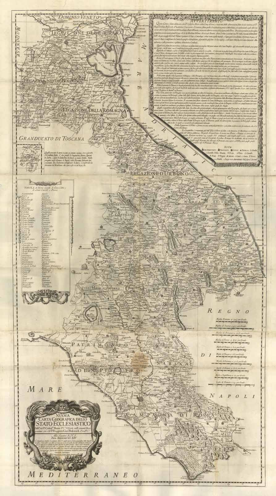 Carta geografica entro margine graduato, in tre fogli, raffigurante il territorio dello Stato Ecclesiastico. L’incisione presenta un elevato valore storico-culturale in quanto rappresenta la prima carta parziale d’Italia realizzata in base ad operazioni scientifiche, segnando l’inizio di una nuova era nella storia della cartografia italiana: “cangiò d’un tratto tutto l’aspetto delle carte geografiche dell’Italia Centrale”. (Schiapparelli 1871) I lavori per la realizzazione di quest’opera vanno contestualizzati nel periodo in cui “si agitava nel campo scientifico la questione della irregolarità della forma della Terra, che le misure astronomico-geodetiche, compiute in varie parti del Globo nella prima metà del secolo XVIII, facevano sospettare.”. (Mori 1922: p. 74) Questo aspetto viene ribadito nel grande cartiglio dedicato all’«Avvertimento» in cui si legge: “L’occasione è stata quella di misurare un grado di Meridiano per confrontarlo cogli altri misurati altrove dagli Accademici dell’Accademia Reale di Francia, e ricavarne ulteriori notizie sulla figura della Terra.”.Ruggero Boscovich, il quale si trovava a Roma come professore di matematica nel Collegio Romano, riteneva che la misura di archi di meridiano compresi all’incirca tra gli stessi paralleli, ma a diversa longitudine, avrebbero potuto accertare, per il nostro pianeta, se si potesse propendere per la forma di un ellissoide di rotazione. Trovato l’appoggio del Cardinal Valenti, ministro del Papa Benedetto XIV, ebbe dal Pontefice l’incarico d’intraprendere tali misure avvalendosi della cooperazione del Padre Cristoforo Maire, gesuita inglese allora residente e Roma, appassionato e cultore degli studi geografici ed astronomici. Importante notare come il Maire suggerì “che di questa impresa scientifica fosse tratto partito, anche per rettificare la Carta dello Stato, riconosciuta già difettosissima, onde tutto fu predisposto perché le osservazioni astronomiche e geodetiche venissero sviluppate in modo da servire altresì agli scopi cartografici, fissando la posizione geografica delle principali città ed eminenze della Regione.” (Mori 1922: p. 75) Le operazioni sul terreno vennero iniziate nell’estate del 1750 e condotte a termine nel giro di tre anni. Vennero misurate due basi in prossimità degli estremi dell’arco da misurare e cioè una presso Roma lungo la Via Appia, tra il monumento sepolcrale di Cecilia Metella e il Casale delle Frattocchie, mentre la seconda lungo il litorale adriatico a partire dalla foce dell’Ausa in direzione di Pesaro. Le due basi vennero congiunte da una rete trigonometrica formata da 9 triangoli i cui vertici furono stabiliti rispettivamente sulla cupola di S. Pietro a Roma, e sui Monti Gennaro, Soriano nel Cimino, Fionchi, Pennino, Tezio, Carpegna, Catria, Luro, tutti individuati da appositi segnali.Dalla misura dell’arco di meridiano venne ricavato un valore notevolmente diverso da quello che sarebbe dovuto risultare coi dati del Cassini in Francia e questo confermava l’ipotesi del Boscovich della irregolarità presentata dalla forma geometrica della terra. Per quanto riguarda la rettificazione della Carta dello Stato Ecclesiastico il lavoro non era ancora finito. Si dovette procedere all’inserimento nelle maglie della triangolazione fondamentale, numerosi altri triangoli secondari. Vennero fissate le posizioni di 84 località dello Stato, derivandone le coordinate geografiche da quelle del Collegio Romano in Roma. Nella rete così ottenuta il Padre Maire poté inquadrare i materiali topografici e cartografici ritenuti più attendibili. Si arrivò in fine al disegno della “Nuova Carta Geografica dello Stato Ecclesiastico…” che la Calcografia Camerale incise su rame e pubblicò nel 1755.Il grande cartiglio nell’angolo in alto a destra relativo all’«Avvertimento» riporta numerose informazioni relative alla carta: “non è stata loro incombenza di formare un’esatta Carta topografica delle parti minute dello Stato Pontificio…si sono corretti infiniti sbagli di tutte le carte fin ora uscite. Si ritrovano in questa Carta poste al luogo loro tutte le città, quasi tutte le Terre, e la maggior parte de’ Castelli, ed altri luoghi compresi nello Stato medesimo, senza pericolo dello sbaglio in un minuto nella loro positura, essendo stati trigonometricamente determinati colla maggiore diligenza possibile…Tra le montagne molti anno sfuggita anche la vista, o pel loro sito, o per le continue nebbie e caligini. Per non lasciare priva la Carta di questi, non trovandosi sicurezza alcuna nelle carte fin’ ora publicate, si sono fatte fare delle osservazioni da persone capaci sulli luoghi ben determinati nel loro giro, per determinarli. Oltre à luoghi così determinati con tutta sicurezza, sene sono posti nella Carta molti altri meno sicuri, benche anche questi non presi comunque dalle carte, ma dà documenti…Questi luoghi sono stati nella Carta contrasegnati generalmente con una lunetta messa loro accanto…In ordine alle cose più minute, e che più appartengono alla Topografia, gli Autori non si impegnano punto. La forma delle città è puramente arbitraria, non essendosi presa alcuna misura sul contorno delle loro mura. I confini tanto di tutto lo Stato, quanto de’ Territorj sono stati messi per lo più puramente a occhio, essendovene molti anche litigiosi o incerti…Le strade si sono lasciate, toltene quelle delle poste, e in queste i siti delle poste medesime sono stati ben determinati quasi tutti…Il corso de’ Fiumi si è preso per lo più dalle carte, che si sono giudicate le meno cattive, toltone il Tevere dalla Fratta di Perugia in giù, il Teverone, quelli che attraversano la pianura del Bolognese, e alcuni altri pochi, de’ quali si è avuto il corso esattemente delineato…La Longitudine è computata qui dall’Isola di Ferro al solito, e la direzione de’ Meridiani si è determinata coll’ultima esattezza. 