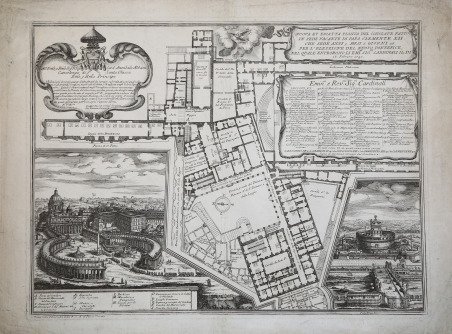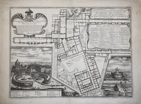 Nuova et essatta Pianta del conclave Fatto in sede vacante di Papa Clemente XII che sedè anni 9 mesi 6 giorni 26 per l'Elezzione del Nuovo Pontefice. pianta del Conclave del 1740 Nel cartiglio in alto a sinistra troviamo la dedica al cardinale Albani: All'Em(inetissim)o, e R(everentissi)mo Sig.(no)r Card(inale) Annibale Albani / Camerlengo di Santa Chiesa / E(minentissi)mo, e R(everentissi)mo Principe . Umiliss(m)o Dev(ot)o, et Obblig(at)o Servitore / Gio(vanni) Domenico Campiglia. Pianta delle disposizioni per il conclave per l'elezione del successore di papa Clemente XII, con vista di San Pietro in basso a sinistra e di Castel Sant'Angelo in basso a destra. ' Sebbene l’incisore della lastra sia Paolo Pilaja, si indica quale autore il disegnatore della stampa Giovan Domenico Campiglia, che compare nell'iscrizione come dedicante, perché è nota la sua attività a Roma, già dal secondo decennio del XVIII secolo, quale disegnatore di incisioni. La calcografia R. C. A. a piè di marmo è da identificare colla Calcografia della Reverenda Camera Apostolica di Roma attiva tra il 1740 al 1860. Nel 1738 papa Clemente XII acquistò le quasi diecimila matrici dell’antica stamperia De’ Rossi alla Pace, in attività fin dall’inizio del Seicento. Si trattava di un’operazione dai precisi risvolti politici, che mirava a mantenere un certo controllo sulla diffusione delle immagini della capitale pontificia e a preservare la memoria del suo glorioso passato. Perito di parte papale nell’acquisizione dei rami De’ Rossi era stato proprio Giovan Domenico Campiglia che, nello stesso 1738 fu nominato soprintendente e amministratore della Calcografia. ' Acquaforte e bulino, impressa su carta vergata coeva, con margini, tracce di pieghe di carta visibili al verso, minimi restauri lungo la piega centrale, per il resto in ottimo stato di conservazione. Molto rara. Bibliografia Sonia Amadio in Giovanna Sapori, Il Mercato delle Stampe a Roma XVI-XIX secolo, Roma 2008, pp.151-172 and pp.265-31. Nuova et essatta Pianta del conclave Fatto in sede vacante di Papa Clemente XII che sedè anni 9 mesi 6 giorni 26 per l'Elezzione del Nuovo Pontefice. On the top left cartouche the dedication to the cardinal Albani: All'Em(inetissim)o, e R(everentissi)mo Sig.(no)r Card(inale) Annibale Albani / Camerlengo di Santa Chiesa / E(minentissi)mo, e R(everentissi)mo Principe . Umiliss(m)o Dev(ot)o, et Obblig(at)o Servitore / Gio(vanni) Domenico Campiglia. Plan of arrangements for the conclave to elect a successor to Pope Clement XII, with view of St. Peter's inset lower left and of the Castel Sant'Angelo inset lower right. Although the engraver of the plate is Paolo Pilaja, the author of the engraving is indicated as Giovan Domenico Campiglia, who appears in the inscription as the dedicator, because he is known to have worked in Rome since the second decade of the 18th century as an engraver. The R. C. A. chalcography at the foot of the marble is to be identified with the Calcografia of the Reverenda Camera Apostolica of Rome, active between 1740 and 1860. ' In 1738, Pope Clement XII purchased almost ten thousand plates from the ancient De' Rossi alla Pace printing house, which had been in business since the beginning of the seventeenth century. It was an operation with precise political implications, which aimed to maintain a certain control over the spread of images of the papal capital and to preserve the memory of its glorious past. Giovan Domenico Campiglia was the expert of the papal part in the acquisition of the De' Rossi branches and in 1738 he was appointed superintendent and administrator of the Calcografia. Etching and engraving, printed on contemporary laid paper, with margins, traces of paper folds visible on the verso, minimal restoration along the central fold, otherwise in excellent condition. Very rare. ' Bibliografia Sonia Amadio in Giovanna Sapori (ed.), Il Mercato delle Stampe a Roma XVI-XIX secolo, Rome 2008, pp.151-172 and pp.265-31. Cfr.