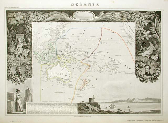 Carta geografica dell'Oceania, entro ricca e decorativa cornice, confini colorati all'epoca