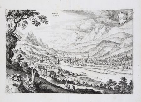 Tavola pubblicata nell'opera Newe Archontologia Cosmica[…] di Johann Philip Zabelin, meglio conosciuto con lo pseudonimo di J.L.Gottfried, arricchita dalle tavole di Mattheus Merian. Edito a Francoforte nel 1638, il Neuwe Archontologia cosmica, Das ist Beschreibung aller Kayserthumben Königreichen und Republiken der gantzen Welt [.] venne ristampato in lingua latina nel 1638 e nel 1649, in lingua tedesca nel 1646 e nel 1695. La stampe di Merian, che sembrano essere state pubblicate anche separatamente, confluirono nel Theatrum Europaeum, una sorta di giornale sulla storia delle terra (in 21 volumi in quarto), ' in lingua tedesca, iniziato da Matthäus Merian e proseguito poi da altre editori, che venne pubblicato tra il 1633 e il 1738. Matthäus Merian il vecchio (1593-1650) incisore svizzero nativo di Basilea, lavorò a Francoforte dove ebbe modo di lavorare nella bottega fondata da Theodor de Bry. Merian si segnalò, tanto da sposare Maria Magdalena de Bry, figlia di Johann Theodore de Bry, e dal 1625 circa da prendere in mano l'azienda, dandole un notevole incremento ed occupandosi in particolare dello sviluppo dei libri di topografia e di viaggi. Nella tipografia Merian lavorarono anche i figli Kaspar e soprattutto il quotato Matthaeus il giovane, i quali dopo la morte del padre proseguirono con immutato successo la gestione dell'attività che continuò fino al 1727. Nel 1638 Merian stampò la Neuwe Archontologia cosmica, das ist, Beschreibung aller Kaÿserthumben, Königreichen und Republicken der gantzen Welt opera sulla descrizione del Mondo già uscita dieci anni prima con una veste modesta che Merian rivoluzionò arricchendola con 98 tavole alcune delle quali a doppio foglio. L'Archontologia conobbe altre quattro edizioni fino al 1695 con testo o in latino o in tedesco, non omogenee per numero e tipologia di incisioni inserite. Nel 1640 venne pubblicato Itinerarium Italiæ Nov-antiquæ scritto da Martin Zeiller, ristampato nel 1688 col titolo Topographiæ Italiæ. Incisione in rame, in buono stato di conservazione. This plate was first used in Johann Ludwig Gottfried, Neuwe Archontologia Cosmica […], first published by Matthias Merian in 1638, and reissued in numerous later editions. The print seems also to have been published separately.Then it was included in the Theatrum Europaeum; was a journal on the history of the German-speaking lands by Matthäus Merian, published between 1633 and 1738 in 21 quarto volumes. Matthäus Merian the Elder (1593-1650) Swiss engraver native of Basel, worked in Frankfurt where he was able to work in the workshop founded by Theodor de Bry. Merian distinguished himself, so much so that he married Maria Magdalena de Bry, daughter of Johann Theodore de Bry, and from about 1625 he took over the company, giving it a considerable increase and dealing in particular with the development of topography and travel books. The Kaspar sons and above all the renowned Matthaeus the younger also worked in the Merian typography, who after the death of their father continued with unchanged success the management of the business which continued until 1727. In 1638 Merian printed the Neuwe Archontologia cosmica, das ist, Beschreibung aller Kaÿserthumben, Königreichen und Republicken der gantzen Welt works on the description of the World already published ten years earlier with a modest look that Merian revolutionized by enriching it with 98 tables, some of which are double sheets. The Archontologia went through four other editions up to 1695 with text either in Latin or in German, not homogeneous in terms of the number and type of engravings inserted. In 1640 Itinerarium Italiæ Nov-antiquæ written by Martin Zeiller was published, reprinted in 1688 with the title Topographiæ Italiæ. Etching, very good condition. Cfr.