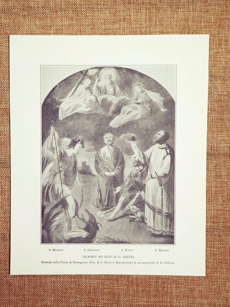 Olio di Soleri da acquarello di Chelius Chiesa di Domagnano San Marino nel 1911 Rara stampa estratta da pubblicazione del 1999 Santi Michele, Giulio, Rocco e Marino Olio di Soleri da acquarello di Chelius Chiesa di Domagnano San Marino nel 1911 Codice prodotto: S.I. - 063 Dimensioni: Cm 18,00 x 21,00