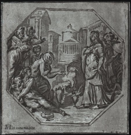 Chiaroscuro a tre legni, circa 1540. Esemplare nel secondo stato, con il monogramma e l’indirizzo dell’editore Andrea Andreani e la data, aggiunti in basso a destra AA in mantova 1602. Ottima impressione, stampata con tono su carta coeva di colore azzurro, piccolo restauro perfettamente eseguito agli angoli di sinistra, leggerissime abrasioni visibili al verso, per il resto in ottime condizioni. La composizione deriva da una decorazione per il soffitto di Palazzo Grimani a Venezia, oggi perduta, realizzata da Francesco Salviati nel 1539. Bartsch e molti studiosi successivi attribuirono la stampa ad Antonio da Trento, ma Passavant, seguendo l'opinione di Mariette, la assegnò correttamente a Niccolò Rossigliani detto il Vicentino. Più recentemente, anche S. Boorsch attribuisce quest’opera al Vicentino, venendo seguita da Naoko Takahatake ('The chiaroscuro woodcut in Renaissance Italy', Los Angeles 2018, cat. 62-63), che concorda con l'attribuzione al Vicentino: “Poco dopo il suo arrivo a Venezia nell'estate del 1539, Francesco Salviati (1510-1563) era al lavoro su Onori resi a Psiche, un dipinto ottagonale commissionato per ornare un soffitto nel palazzo di Giovanni Grimani a Santa Maria Formosa. Il palazzo ospitava un’importante collezione di antichità ed era decorato con temi antichi, tra cui l'attuale soggetto delle Metamorfosi di Apuleio raffigurante la bella principessa Psiche ammirata dai suoi cittadini. Prima grande opera del Salviati in città, il dipinto - ritenuto perduto nell'Ottocento, fino alla sua recente riscoperta - ricevette il superlativo plauso del suo caro amico e conterraneo toscano Giorgio Vasari, che lo descrisse come "l'opera più bella del pittura che c'è in tutta Venezia". La stampa si discosta dal dipinto in numerosi dettagli: la posizione di Psiche e la posizione della sua mano destra sono modificate; la figura dietro di lei è tagliata meno strettamente e tiene un bastone assente nel dipinto; e l'elaborato prospetto urbano della stampa sostituisce il tempietto isolato (piccola struttura rotonda del tempio) e suggestioni di antiche rovine. Le differenze tra la stampa e il dipinto finito possono indicare che l’intagliatore ha lavorato da un disegno preliminare di qualche tipo. Come ha rivelato lo studio del dipinto di Andrea De Marchi, Salviati ha apportato modifiche al progetto nel corso della sua esecuzione. Sebbene Salviati non abbia sviluppato una collaborazione duratura con nessun singolo incisore, ha dimostrato interesse a far diffondere i suoi progetti sotto forma di stampe per tutta la sua carriera. Vasari ricorda come il Salviati avesse lasciato dei disegni a Bologna da incidere a Girolamo Fagiuoli, poco prima del suo arrivo a Venezia. Mentre molte stampe dopo Salviati sono sia non firmate né datate, alcune di esse possono essere datate al 1540, tra cui questa Onori resi a Psiche. Pierre Jean Mariette ha correttamente identificato la stampa non firmata come opera di Niccolò Vicentino. Alcuni scrittori successivi, tra cui il Bartsch, hanno attribuito, invece, l’intaglio ad Antonio da Trento. Tuttavia, nella suddivisione del disegno su tre blocchi, Onori resi a Psyche ricorda molto il Cristo risana i lebbrosi firmato dal Vicentino. In entrambe le stampe, il blocco centrale rende schematicamente l'architettura sullo sfondo, mentre il blocco scuro rafforza i contorni e le ombre in primo piano per trasmettere una prospettiva atmosferica. Anche il carattere del taglio è simile, con contorni fluidi e lunghe linee parallele leggermente ondulate di ombreggiatura profonda. Inoltre, la delineazione delle alte luci sul piano terra trova uno stretto parallelo nella Morte di Aiace, sempre firmata” (cf. N. Takahatake, 'The chiaroscuro woodcut in Renaissance Italy', p. 161). Bibliografia Bartsch XII.125.26 (Antonio da Trento); Le Blanc II. 218.8 ; Passavant VI.222.26; Davis, Mannerist Prints, no. 53 (Niccolò Vicentino); Matile 2003, n. 70 (Niccolò Vicentino); . Chiaroscuro woodcut from three blocks, circa 1540. Example in the second state of two, inscribed with publisher's address and date lower left 'AA in mantoua. 1602'. A very good impression, printed with tone on contemporary blue paper, small restoration perfectly carried out in the lower and upper left corners, very light abrasions visible on verso, otherwise in excellent condition. The composition derives from Francesco Salviati's ceiling decoration of 1539 in the Palazzo Grimani near Santa Maria Formosa, Venice. Bartsch and many later writers attributed the print to Antonio da Trento, but Passavant, following Mariette's opinion, correctly assigned it to Niccolò Rossigliani called Vicentino. Also S. Boorsch attributes this work to Vicentino; Naoko Takahatake ('The chiaroscuro woodcut in Renaissance Italy', Los Angeles 2018, ' cats. 62-63), agrees with the attribution to Vicentino: “Shortly after his arrival in Venice in the summer of 1539, Francesco Salviati (1510-1563) was at work on Honors Rendered to Psyche, an octagonal painting commissioned to adorn a ceiling in Giovanni Grimani's palazzo at Santa Maria Formosa. The palazzo housed an important collection of antiquities and was decorated with ancient themes, including the present subject from Apuleius's Metamorphoses depicting the beautiful princess Psyche admired by her citizens. Salviati's first major work in the city, the painting-thought to have been lost in the nineteenth century, until its recent rediscovery-received the superlative praise of his close friend and fellow Tuscan Giorgio Vasari, who described it as “the most beautiful work of painting that there is in all Venice”. The print departs from the painting in a number of details: Psyche's stance and the position of her right hand are modified; the figure behind her is less tightly cropped and holds a stick absent in the painting; and the print's elaborate urban prospect replaces the isolated tempietto (small, round temple structure) and suggestions of ancient ruin