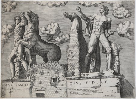 RARA VARIANTE stampata da Claudio Duchetti nel 1584, probabilmente incisa da Ambrogio Brambilla, copiando la lastra stampata da Antonio Lafreri nel 1546.Bulino, 1584, sul piedistallo, a sinistra: 'OPUS PRAXITELIS; a destra: OPUS FIDIAE, subito sotto: 'HEVS TU QVI PRAETERIS MORARE PAVLVM AC INSPICE/IN QVIRINALI HI SVNT EQVI MARMOREI MVTILI ATQVE GRANDES ARTE VICTA NATVRA PARENS SPIRITVM CVR EPIRIT QVID PRAXITELES ET FIDIAS EFFINXERE ISTOS AEMVLAMVR SAT DIXI ABEL VALE SALVE MISCE BIBE DA MI; in basso a destra i dati editoriali 'ROMAE 1584/CLAUDII DUCHETI FORMIS'. Magnifico esemplare, impresso su carta vergata coeva, rare e lievissime fioriture, un piccolo foro sulla sinistra, verso il basso, nel complesso in ottimo stato di conservazione.Erroneamente considerata quale variante della lastra pubblicato nel 1546 da Antonio Lafreri, come parte dello Speculum Romanae Magnificentiae, a sua volta copia in controparte di un foglio anonimo edito, senza data, da Antonio Salamanca, questa versione con l’indirizzo del Duchetti è invece una copia, molto simile al modello, da cui differisce in diversi particolari.Con la divisione ereditaria della tipografia Lafreri del 1581, la lastra originaria spettò al cugino di Claudio, Stefano Duchetti (cfr. V. Pagani. The dispersal of Lafreri’s inheritance, 1581-89, table a. Inventory of the Stefano Duchet – Paolo Graziani sale, 8 agosto 1581 p. 15 n. 23 “Il Cavallo de Campidoglio”, in Print Quarterly, vol. 25, n. 1, 200), di qui probabilmente l’esigenza per Claudio di farne incidere una nuova versione, forse affidandone l’incisione ad Antonio Brambilla, della cui collaborazione si era avvalso più volte. L’edizione del Duchetti risulta estremamente rara.La prima versione dell'opera fu pubblicata nel 1546 da Antonio Lafreri, a sua volta copia in controparte di un foglio edito, senza data, da Antonio Salamanca.Le statue sono copie romane del II-III secolo di originali greci del V sec. a.C. credute per tanto tempo copie di opere di artisti famosi tanto che sulle base è riportata la scritta “Opus Fidiae” e “Opus Praxitelis” e rappresentano i Dioscuri, i mitologici cavalieri figli di Giove che salvarono l’esercito romano al Lago Regillo.Sin dal Medioevo tutti i visitatori di Roma hanno potuto ammirarle nello stesso luogo dove sono ancora oggi e proprio per la loro presenza il Quirinale venne chiamato Montecavallo.La posizione in cui si trovano oggi è quella progettata da Flaminio Vacca per Sisto V, integrata dalle modifiche apportate nel 1783 da Carlo Antinori per Pio VI. Papa Sisto V voleva creare una mostra adeguata per il castello terminale dell’Acqua Virgo e pensò di utilizzare le due statue gigantesche che già si trovavano sulla piazza ed erano poste di fronte al Palazzo Vercelli o della Consulta; volle far girare le statue in modo che chiudessero visivamente lo scenario della Strada Pia – odierna Via XX Settembre – ed affidò l’incarico a Domenico Fontana che arretrò le statue e le mise in posizione frontale al Palazzo del Quirinale e vi pose una fontana davanti. L’ultimo spostamento delle statue fu voluto da Papa Pio VI che fece innalzare tra i due gruppi marmorei l’obelisco che si trovava nel Mausoleo di Augusto; i due gruppi furono divaricati per lasciar posto all’obelisco e davanti fu posta una vasca di granito che proveniva dal Campo Vaccino a raccogliere l’acqua che ricadeva dallo zampillo dell’Acqua Virgo. L’opera appartiene allo ' Speculum Romanae Magnificentiae, la prima iconografia della Roma antica. ' Lo ' Speculum ' ebbe origine nelle attività editoriali di Antonio Salamanca e Antonio Lafreri (Lafrery). Durante la loro carriera editoriale romana, i due editori - che hanno lavorato insieme tra il 1553 e il 1563 - hanno avviato la produzione di stampe di architettura, statuaria e vedutistica della città legate alla Roma antica e moderna. Le stampe potevano essere acquistate individualmente da turisti e collezionisti, ma venivano anche . A VERY RARE REPLICA by Claudio Duchetti, printed on 1584, probably engraved by Ambrogio Brambilla.Engraving, 1584 circa, inscribed on the pedestal: 'OPUS PRAXITELIS.//OPUS FIDIAE' and below: 'HEVS TU QVI PRAETERIS MORARE PAVLVM AC INSPICE/IN QVIRINALI HI SVNT EQVI MARMOREI MVTILI ATQVE GRANDES ARTE VICTA NATVRA PARENS SPIRITVM CVR EPIRIT QVID PRAXITELES ET FIDIAS EFFINXERE ISTOS AEMVLAMVR SAT DIXI ABEL VALE SALVE MISCE BIBE DA MI and with date and publisher's address lower right: 'ROMAE 1584/CLAUDII DUCHETI FORMIS'. Magnificient example, printed on contemporary laid paper, trimmed close to platemark, occasional light foxing, a little hole on the left edge, generally in very good condition.The engraving depicting the immense statues known as the Dioscuri at the Quirinal in Rome, as these ancient Roman ruins and statuary looked in the mid 16th century prior to being moved and restored in 1588. This plate, with Duchetti’s address has been erroneously considered as a variation of the first one published in 1546 by Antonio Lafreri, as part of the Speculum Romanae Magnificentiae, in turn a counterpart copy of an anonymous sheet published, without date, by Antonio Salamanca. This version is instead a copy of the Lafreri plate, from which it differs in some details.As a result of the hereditary division of the Lafreri typography in 1581, the original plate was inherited by Claudio's cousin, Stefano Duchetti (see V. Pagani. The dispersal of Lafreri's inheritance, 1581-89, table a. Inventory of the Stefano Duchet - Paolo Graziani goes up , August 8, 1581, page 15, No. 23 "Il Cavallo de Campidoglio", in Print Quarterly, vol. 25, n. 1, 200), so Claudio published this new version, perhaps commissioning the engraving to Antonio Brambilla, whose collaboration he had used several times.The Duchetti edition is extremely rare.The first version of this subject was published by Antoine Lafréry in 1546 (as part of Speculum Romanae Magnificentiae) and it is a copy, in reverse, of an a